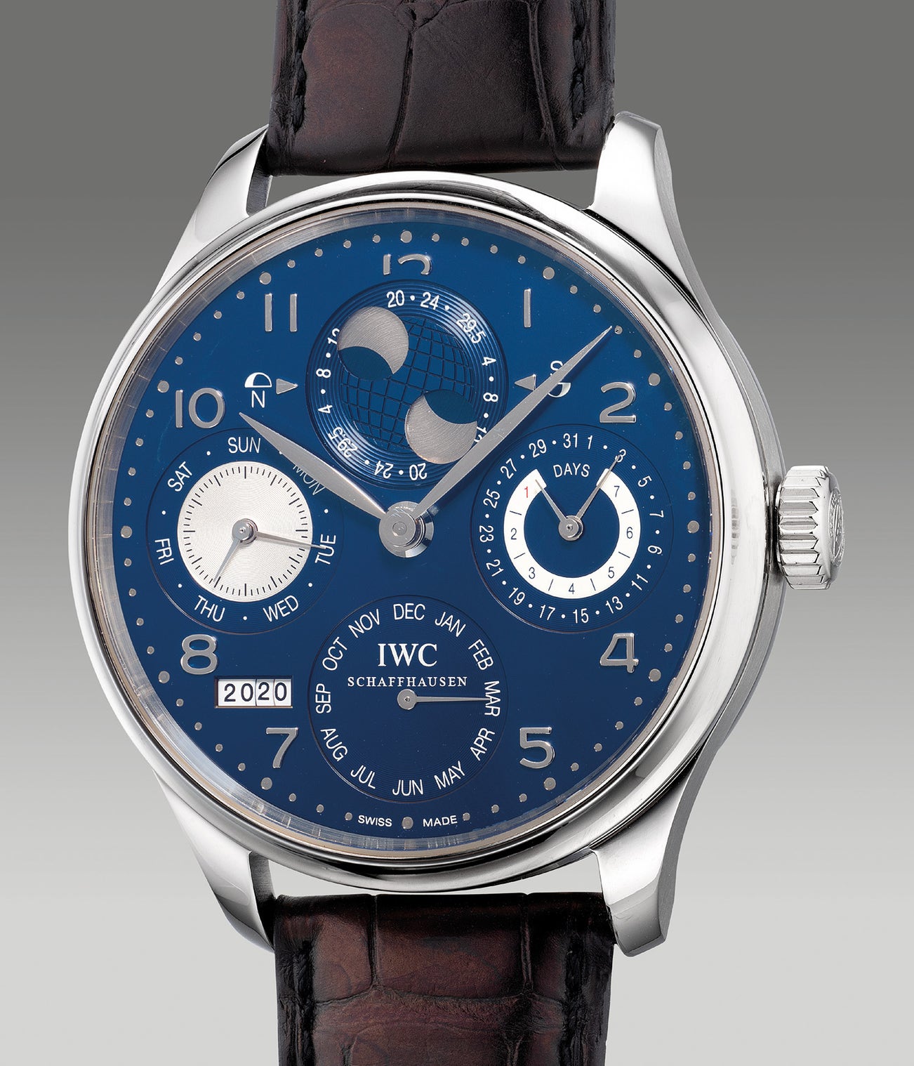 The present example ref. IW503203 is the second Portugieser perpetual calendar reference launched in 2010. Encased in an elegant 44mm diameter white gold case, the blue dial is perfectly matched with silvered accents and applied Arabic numerals. Offered in excellent overall condition, the present lot is accompanied by its full set of accessories and consigned by the original owner.