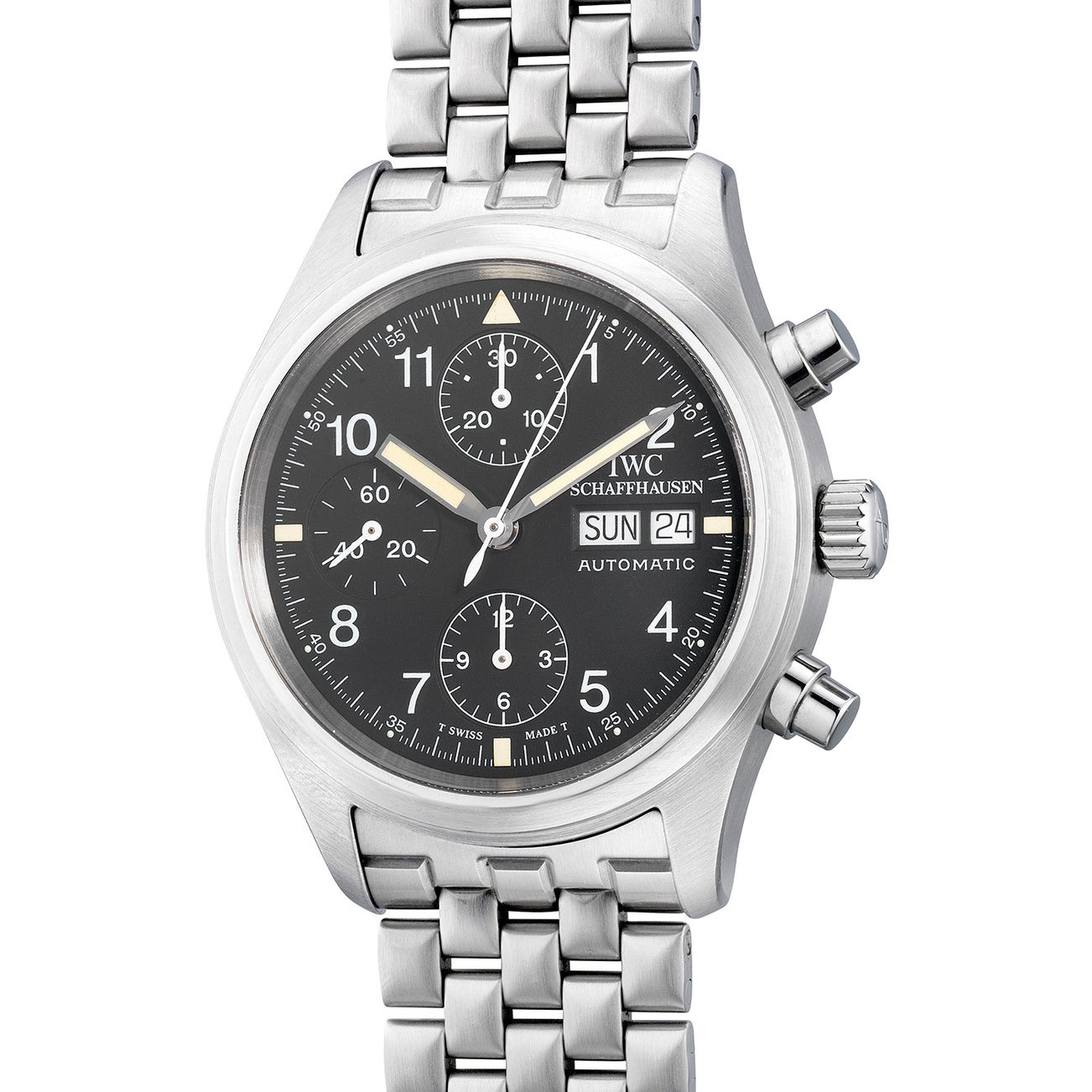 Introduced in 1994, the IWC Fliegerchronograph derives from a long heritage associated with iconic pilot’s wristwatches by the firm. Produced until 2005, the Fliegerchronograph was the brand’s beloved model during the 90s. Featuring a 39mm diameter stainless steel case, the model offers a day and date complication with an ETA 7750 based movement, attractive no-frills three registered black dial and iconic Flieger hands reminiscent of the MK XI model. The present example paired with a stainless steel bracelet is part of an early generation of the ref. 3706 distinct by the tell-tale signs of the use of tritium by the “T” bracketing the SWISS MADE inscription at 6 o’clock. Adorned by collectors with the charm of an aged tritium dial of this early specimen of the ref 3706, the present example accompanied by its original guarantee is an excellent timepiece with incredible vintage appeal.