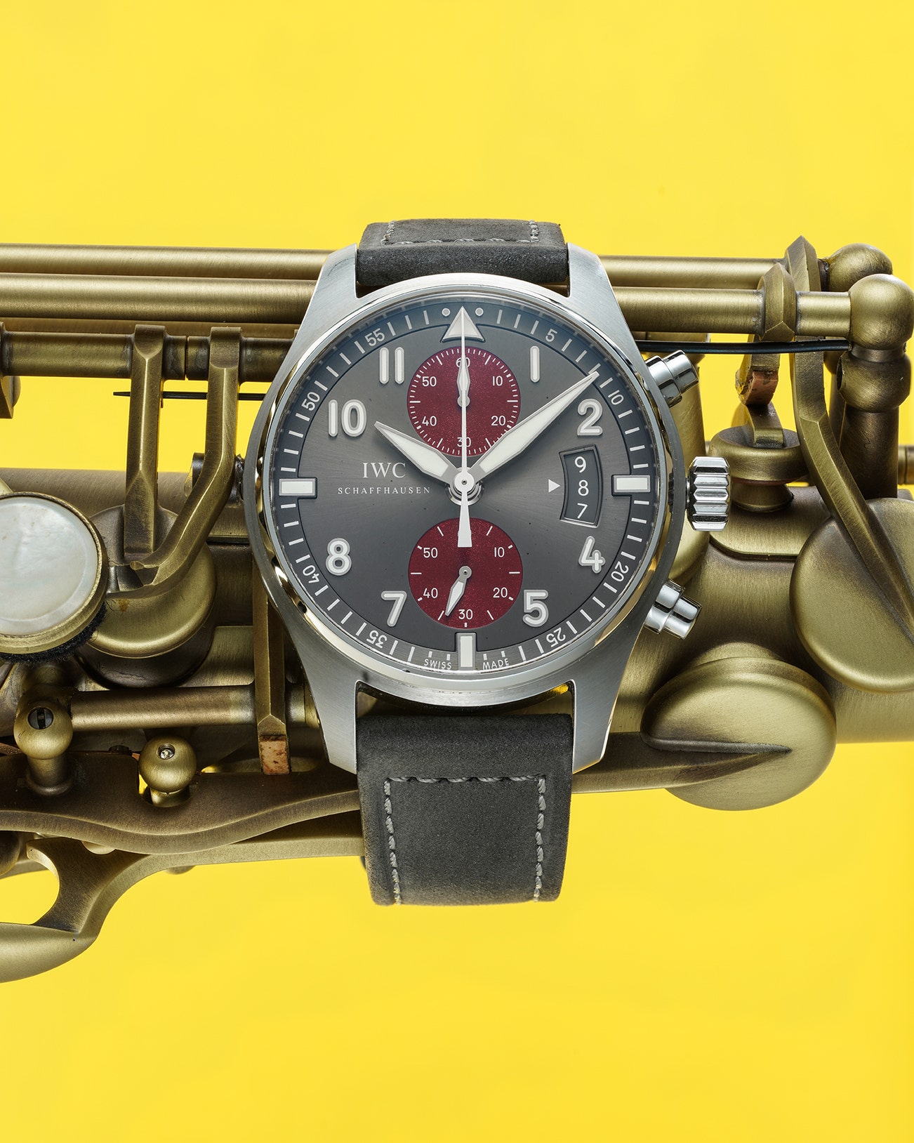 - Featuring a gun-metal greyish dial, reminiscent of the Supermarine Spitfire fighter aircraft, it features two linear burgundy colour sub-dials. The grainy burgundy colour adds depth and flamboyance to an already captivating chronograph. A very useful date function complication has been added at three o'clock, adding to the utility of the timepiece.