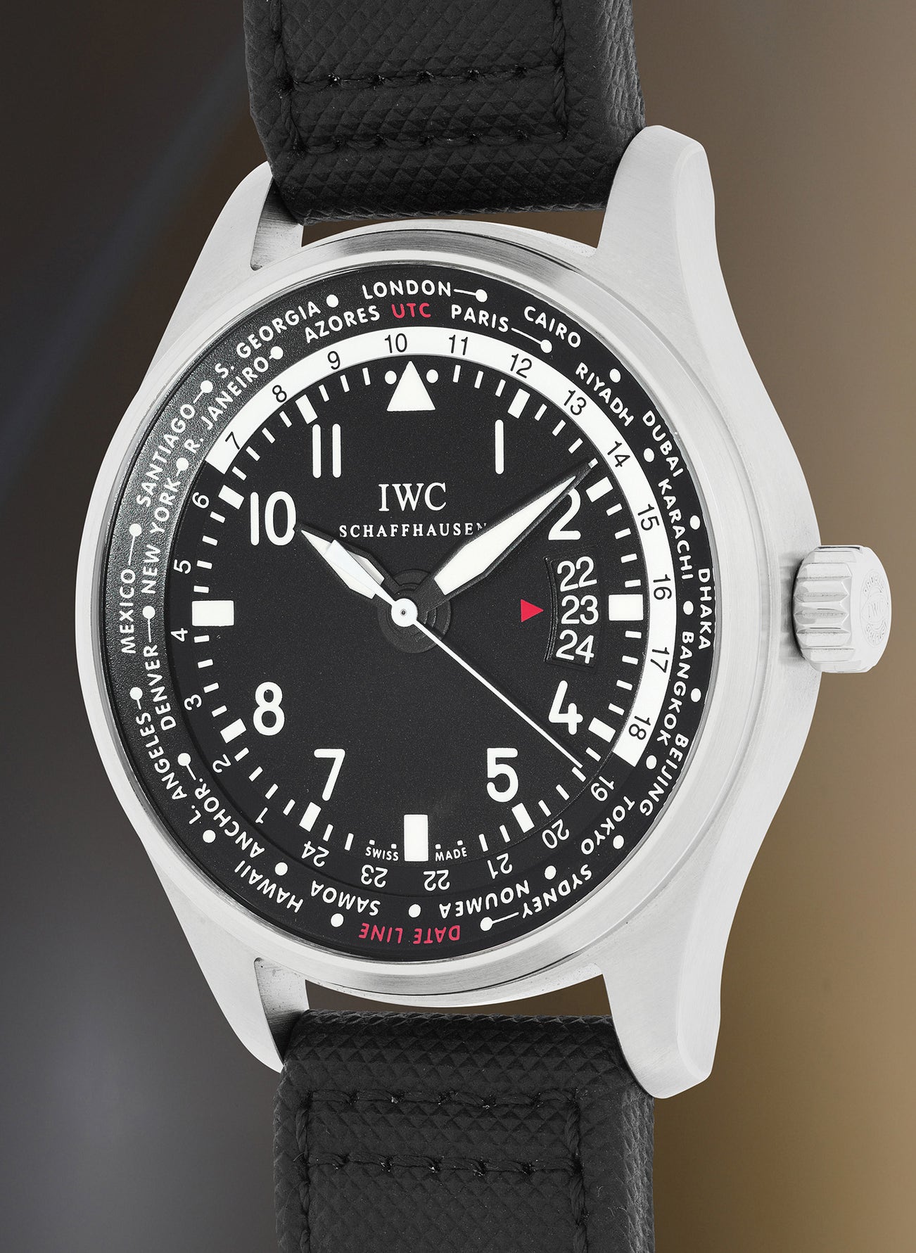 Founded in 1868, the Swiss watch manufacturer IWC Schaffhausen’s first pilot’s watch was introduced in 1936, designed for civilian aviation and known today as the “Mark IX.” The model was the beginning of a long line of exceptional tool watches, which over the decades were upgraded with better movements like the chronometer grade caliber 89, and with novel case materials like ceramic. In 2012, IWC added a new and distinctive complication, the world time function found on the reference 3262-01.