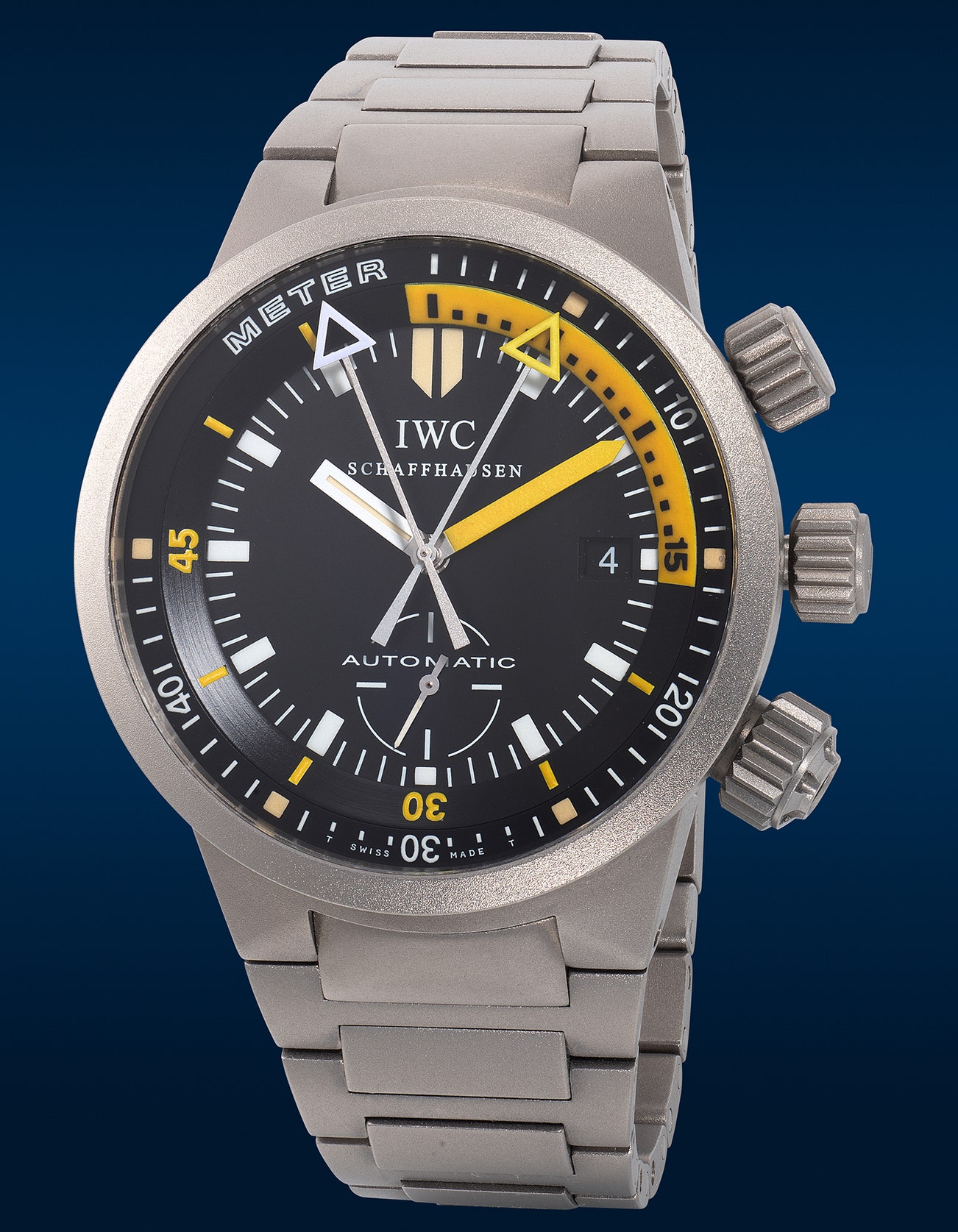 A rare and attractive titanium diver’s wristwatch with small seconds, date, depth gauge, pump, guarantee and presentation box