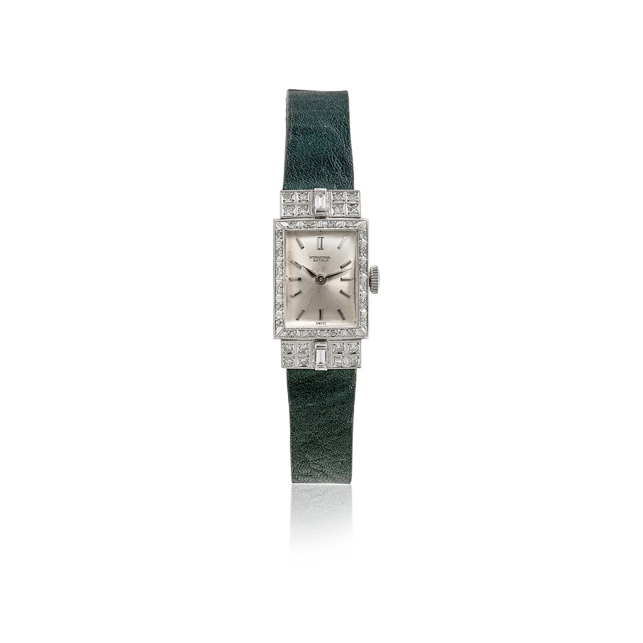 Of manual-winding mechanical movement, silver dial, sword-shaped hands, baton markers, bezel set with single- and rose-cut diamonds, further accented with baguette diamonds, green leather strap, diameter approximately 16mm, length approximately 212mm, dial signed International Watch Co., interior caseback numbered.