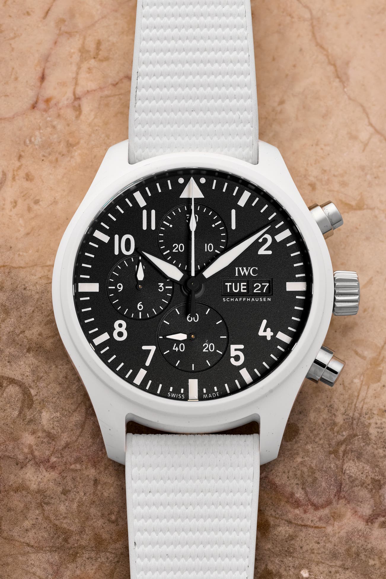 • The Top Gun collection was released in 2007 and inspired by the U. S. Navy’s elite Strike Fighter Tactics Instructor Program. These chronographs were built for durability and precision and today are appreciated by collectors for their classic aesthetic and durability. The Top Gun “Lake Tahoe” was released in 2022 in white ceramic, which was inspired by the Service Dress White US Navy uniforms and the winter landscape around Lake Tahoe. The white ceramic case is complemented by a black dial with black luminous hands, stainless steel pushers and crown, along with the “Top Gun” logo featured on the titanium case back.