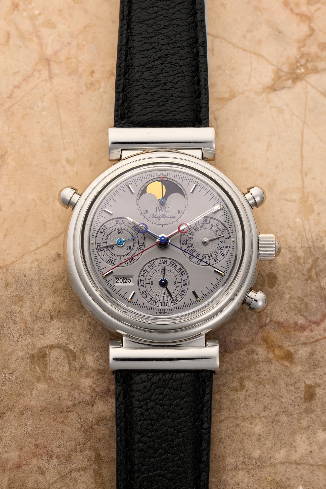 • IWC’s Da Vinci model was an innovative timepiece first released in 1969 with a Beta 21 movement with a distinctive cushion-like case, date, and integral bracelet (reference 3501). It has evolved into one of the brand’s most recognized collections to the present day. Named after Leonardo da Vinci, the well-known Italian polymath and Renaissance painter, the model reflects his technical excellence and artistic design. In 1985 at the Baselworld Watch Fair, IWC released their reference 3750 with the ingenious integrated perpetual calendar module by Kurt Klaus. The watch had a contemporary design with articulated bar lugs, unique pushers, and double tiered round case.