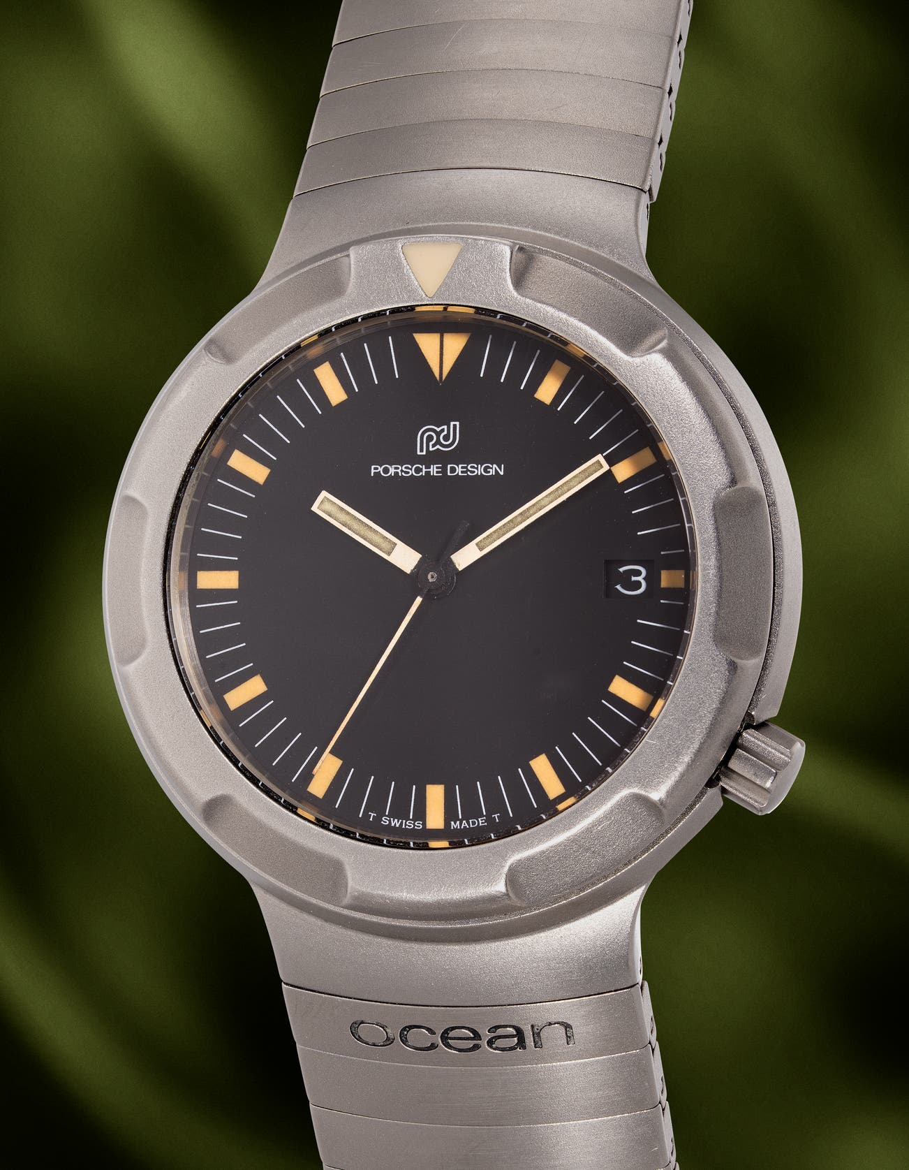• With its 42.5 mm titanium case, the Ocean 2000 was unusually large for its time. Born in 1983, the present example is paired with an early first-generation dial, which only signs Porsche Design, and a third-generation pin-style titanium bracelet, which is a cutting-edge material at the time. The watch’s clean, modern aesthetic perfectly reflects the DNA of both Porsche Design and IWC, making it a landmark in the history of professional dive watches.