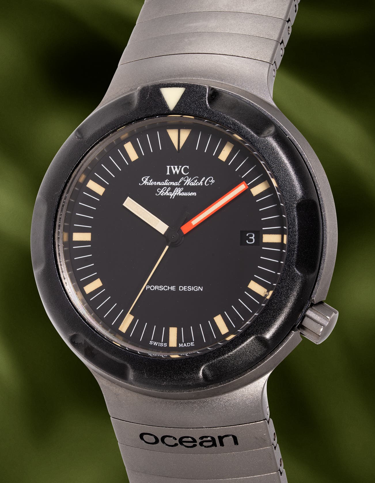 • IWC engineers and Alexander Porsche, who designed the iconic Porshe 911 automobile, collaborated and developed the Ocean BUND watches based on military specifications. These watches were water-resistant to 300 metres, featured flat sapphire crystals, and were designed with high legibility in mind, including orange-red framed minute hands, which differentiate itself from the civilian version. Though never widely issued as standard military gear, they were marked with a 13-digit NATO Stock Number (NSN) on the case backs and straps. This underscores their military-grade engineering and authenticity.