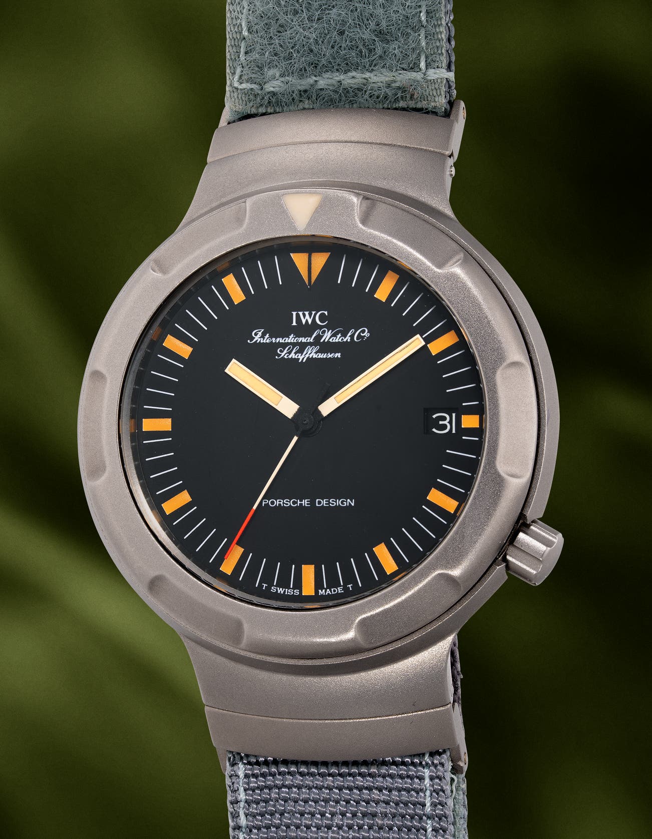 • While originally paired with a titanium bracelet, the present early example from 1983 features a grey Velcro nylon strap, designed for saltwater use and diver comfort. Meanwhile, its dial features a full-signature cursive script logo and a slightly embedded date window in the minute and hour marker. The watch’s clean, modern aesthetic perfectly reflects the DNA of both Porsche Design and IWC, making it a landmark in the history of professional dive watches.
