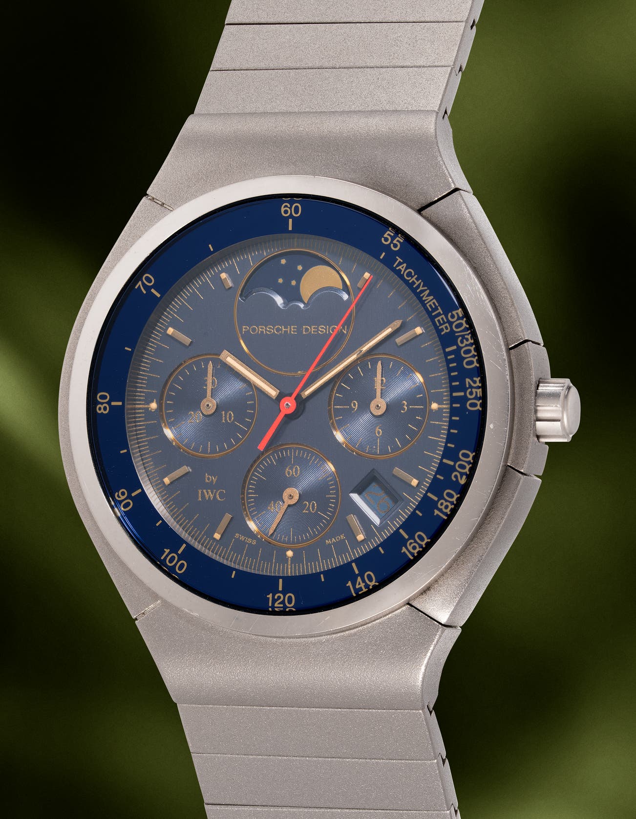 • Four references were produced under this model, all sharing the same dial layout. Each features a moonphase display signed “Porsche Design” in capitalised sans-serif, a 12-hour register at three o’clock, a 60-second register at six o’clock, a 30-minute register at nine o’clock, a date window between four and five o’clock, and the inscription “by IWC.” The references differ in dial colour and bracelet configuration: