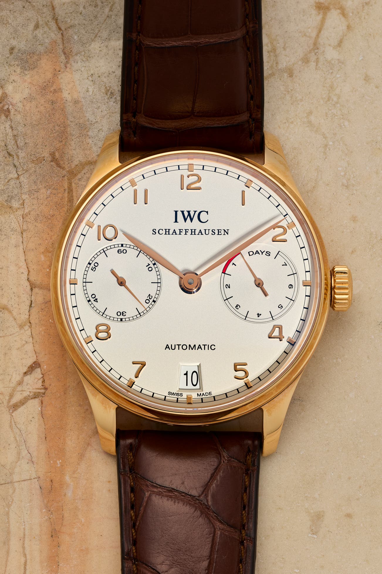 An impressive pink gold wristwatch with 7-day power reserve indicator, date, and seconds