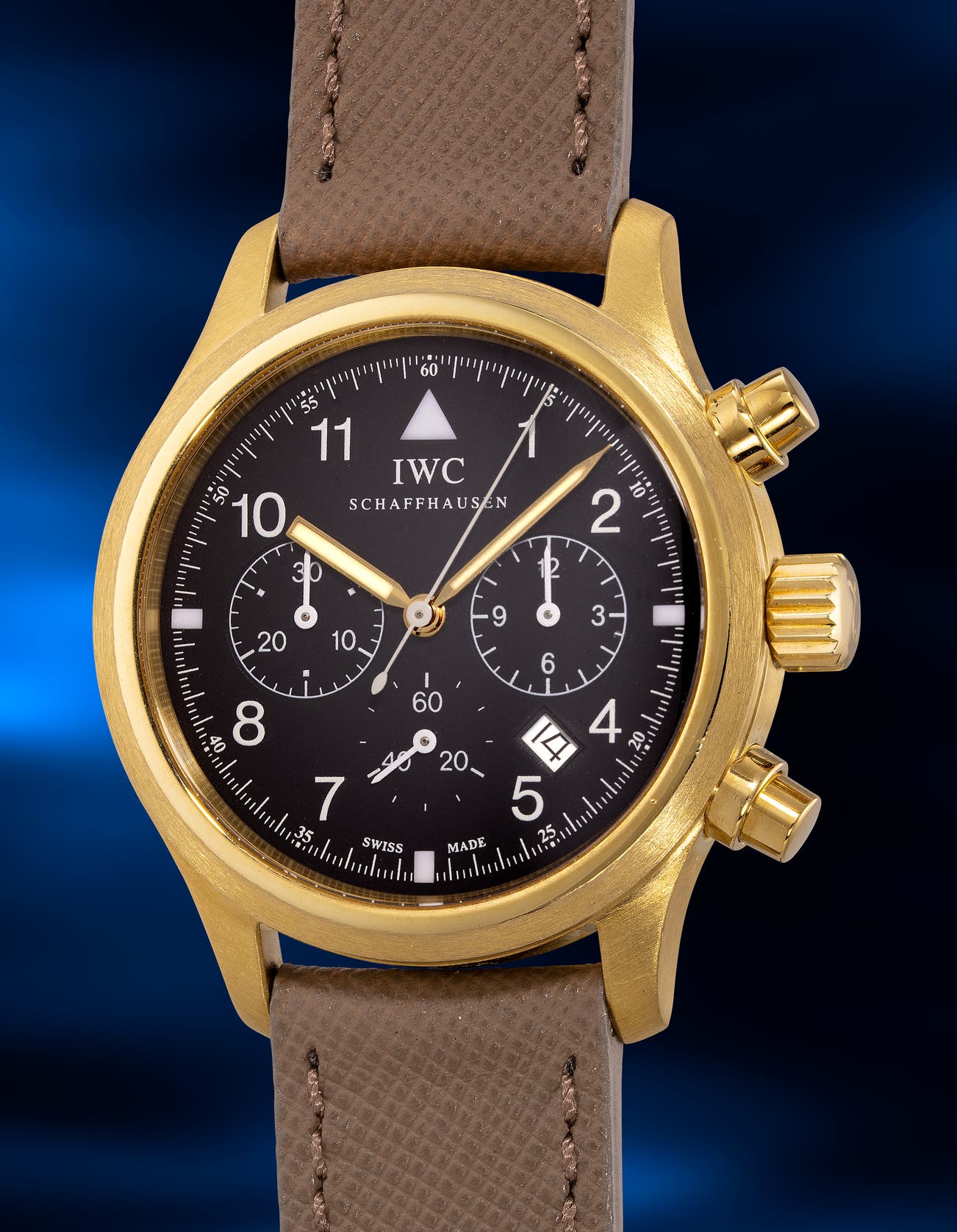 - The present watch shows the typical layout of an IWC pilot’s watch, with a matte black dial, white numerals, sub-dials, and of course, the signature big white triangular marker at the 12 o’clock position.