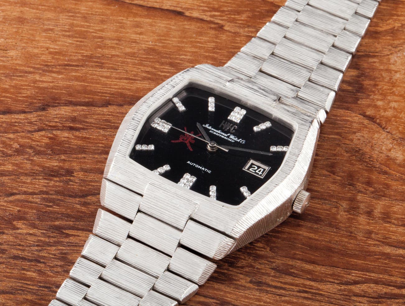 In the late 1960’s and 1970's IWC’s flag ship model was the Da Vinci. The current watch, cased in 18k white gold is powered by the IWC in-house caliber 8541B. The Da Vinci was one of the firms rarest and costliest watches manufactured in the 1960’s and 1970’s. The present watch, made for the Sultanate of Oman is finished throughout with a textured case and bracelet which is remarkably heavy. Its black dial contrasts beautifully with the hour markers composed of diamonds.In exceptional condition, this example is one of the most exclusive designs ever created by IWC.