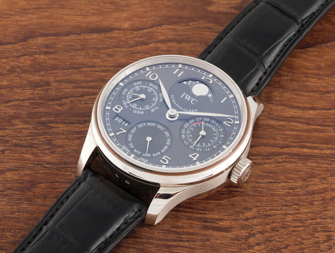 A large white gold perpetual calendar wristwatch with 7 day power reserve and moon phases