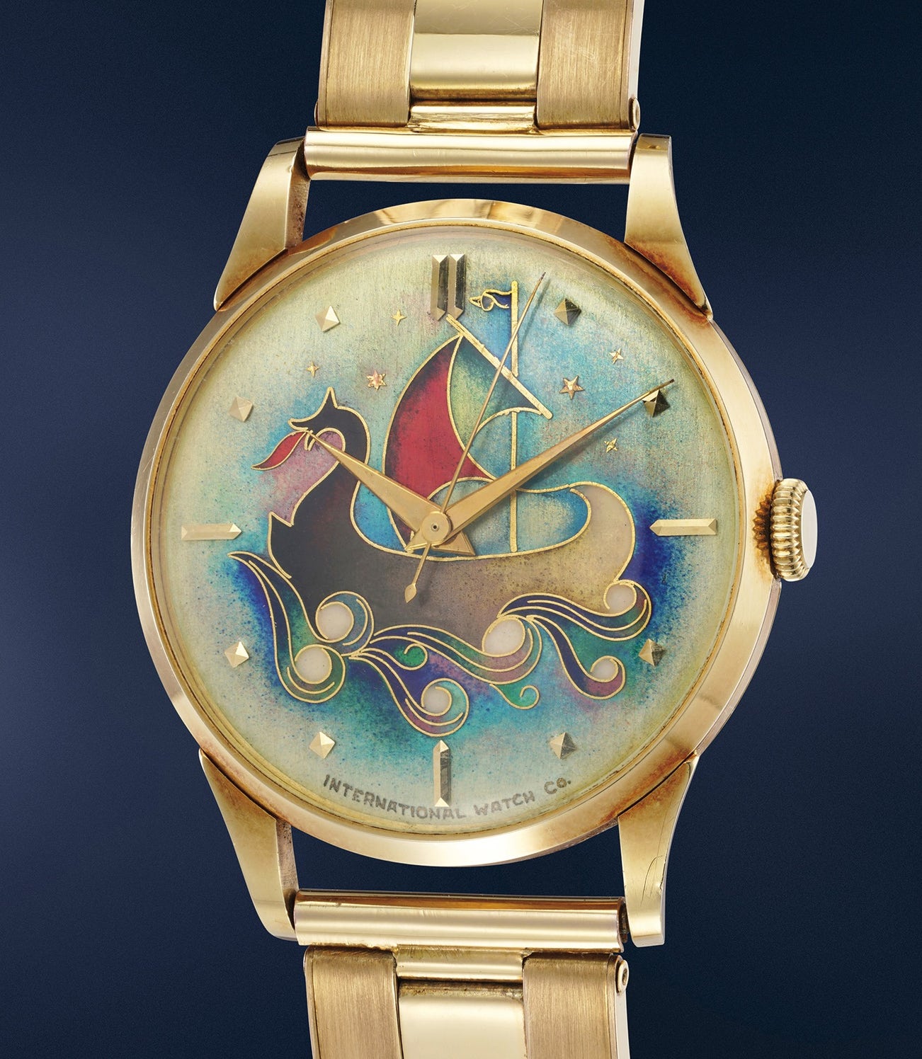 The golden age of enamel dial wristwatches is the late 1940s and 1950s. Following the end of World War II, societal attitudes were changing, class structure becoming less rigid and together with tool wristwatches, enamel dial timepieces brought innovation to a new world order. These rare watches have a striking and appealing look with their carefully created dials and include motifs like landscapes, mythical creatures, geometric stylized designs and similar to the present example boats on the seas. Each is handmade with the enameller laying down a design in fine gold wire, next adding successive layers of enamel within the wire design, and finally firing it in a kiln. While similar designs look identical close inspection demonstrates the individuality of each piece with subtle colour differences and design changes. Today, enamellers’ names are well-known and collectors seek examples by artists like Carlo Poluzzi and Marguerite Koch.
