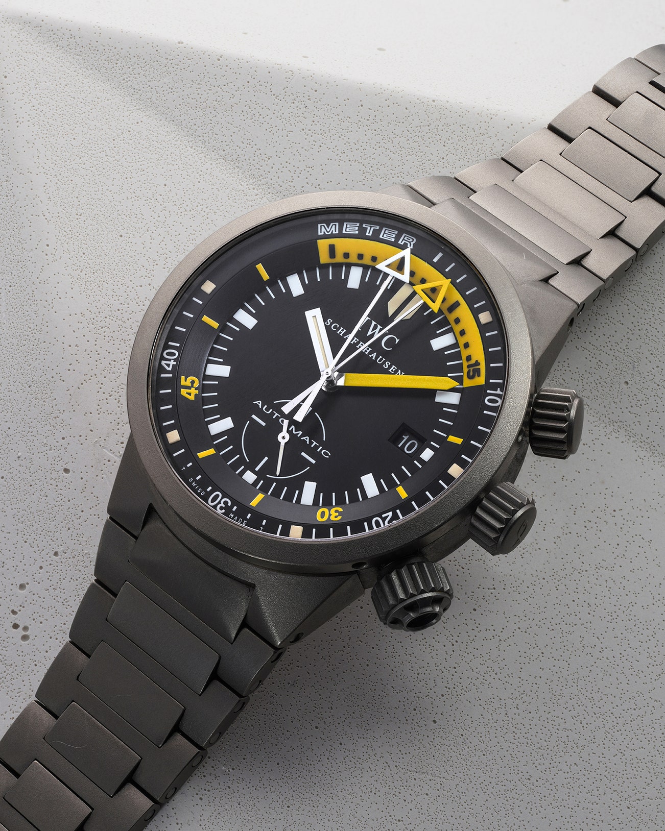 -Introduced in 1999, the IWC Deep One was the first wristwatch in the world to have the combination of mechanical depth gauge, maximum depth display and a rotating bezel to show dive time. It is a "holy grail" of sorts to IWC collectors. The Deep One was part of IWC’s GST (Gold, Steel, Titanium) sport watch line.