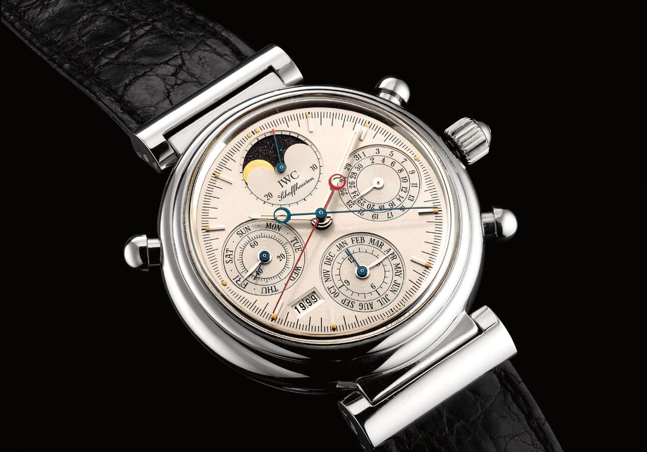 One of IWC's most recognizable complicated timepieces, the Da Vinci series had its beginnings as a quartz movement watch. The first model, from 1969, featured the Beta 21 quartz movement, and was the brand's answer toward bold masculine watches with a casual everyday feel. The brand moved away from quartz movements in 1985 when they released their now iconic masterpiece, the Da Vinci Perpetual Calendar with rounded case and articulated lugs. Over the years, the style has stayed the same, but with variations, from ceramic examples to lady’s watches and in 1995, IWC released the reference 3571 to celebrate the 10th anniversary of the Da Vinci model, featuring a split seconds chronograph addition to the perpetual calendar movement.