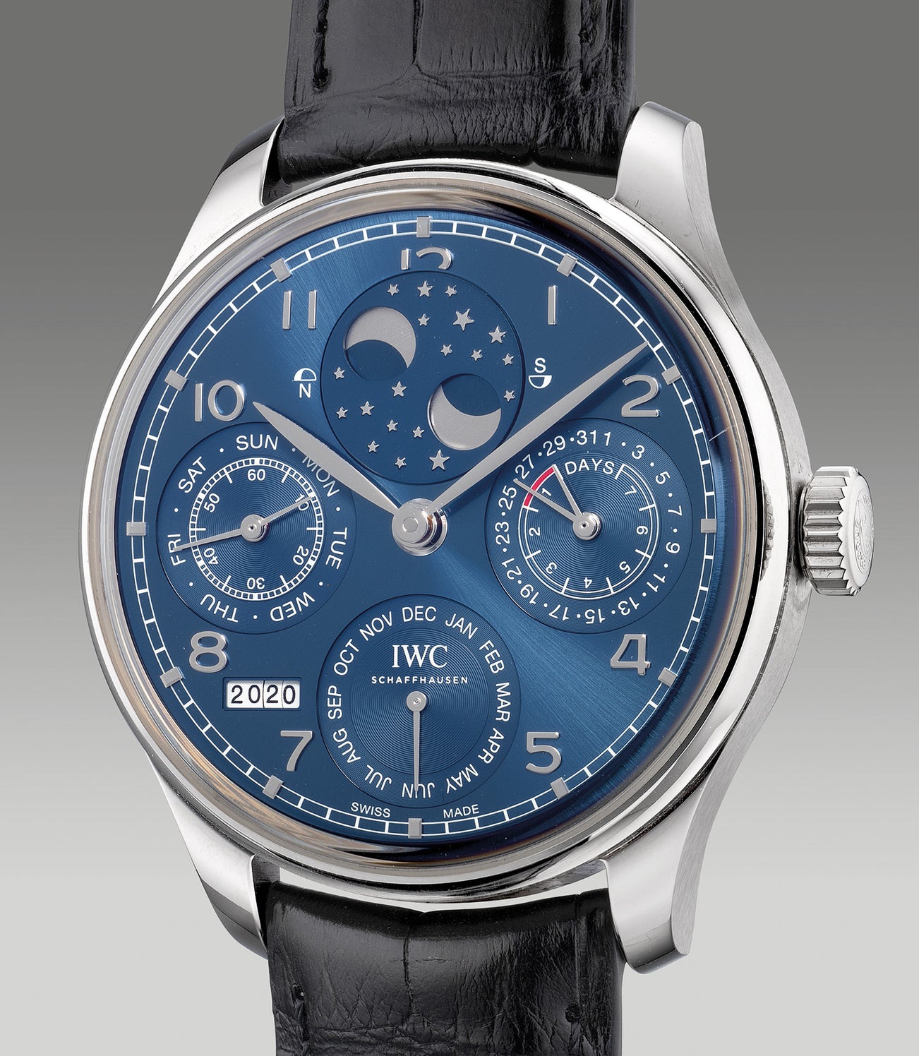 The present Portugieser perpetual calender ref. IW503401 was launched with 3 variants in different metals: platinum with silver dial, pink gold with slate dial, and like the present example, white gold with a stunning blue dial. Symmetrically designed with an off-set digital year display, the watch is proportioned in a graceful 44mm diameter case, the radiant blue dial with silver accents gorgeously changes tones under different light. With the hovering double moon display, the moon phases shows the state of the position in both northern and southern hemispheres with a star-studded night sky. Featuring a Pellaton winding system fitted with enhanced wear-free ceramic components introduced in 2015, the IWC-manufactured calibre 52615 movement comprises of 386 components that offers an impressive 7 days of power reserve. Offered in excellent overall condition, the present lot is accompanied by its full set of accessories.