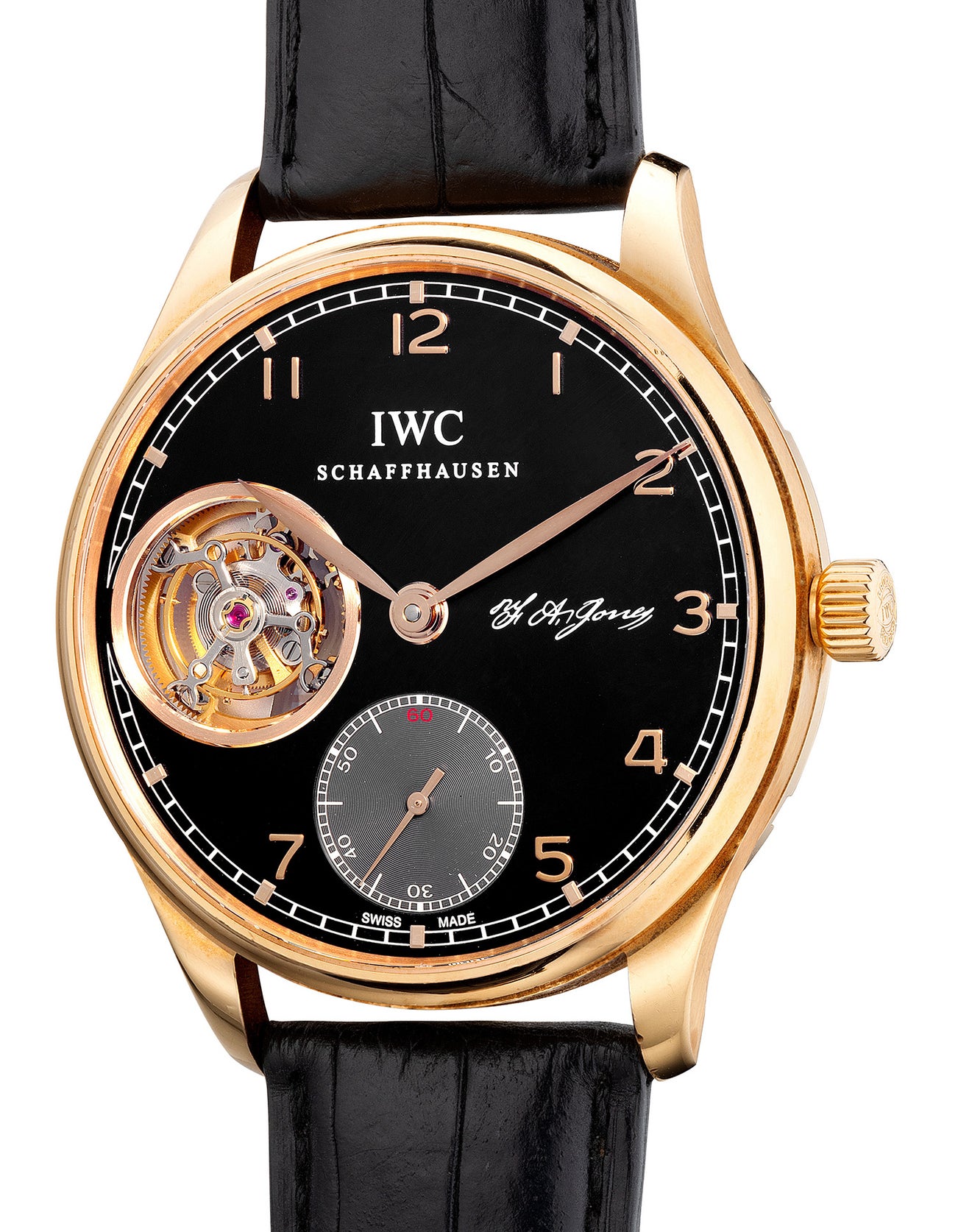 With a movement inspired from their old pocket watch calibers, the Portugieser Tourbillon Handfaufzug is powered by the cal. 98900 inspired from the legendary cal. 98 developed during the 1930’s. Paying homage to its founder, the firm launched the timepiece in 2010 as a limited edition of 50 pieces in 18K yellow gold and 500 pieces in 18K pink gold. Encased in a 43mm diameter case, the matte black dial features applied Arabic numerals in the respective gold with a tourbillon carriage positioned to 9 O’clock, small seconds at 6 O’clock and F.A. Jones’ signature at 3 O’clock.