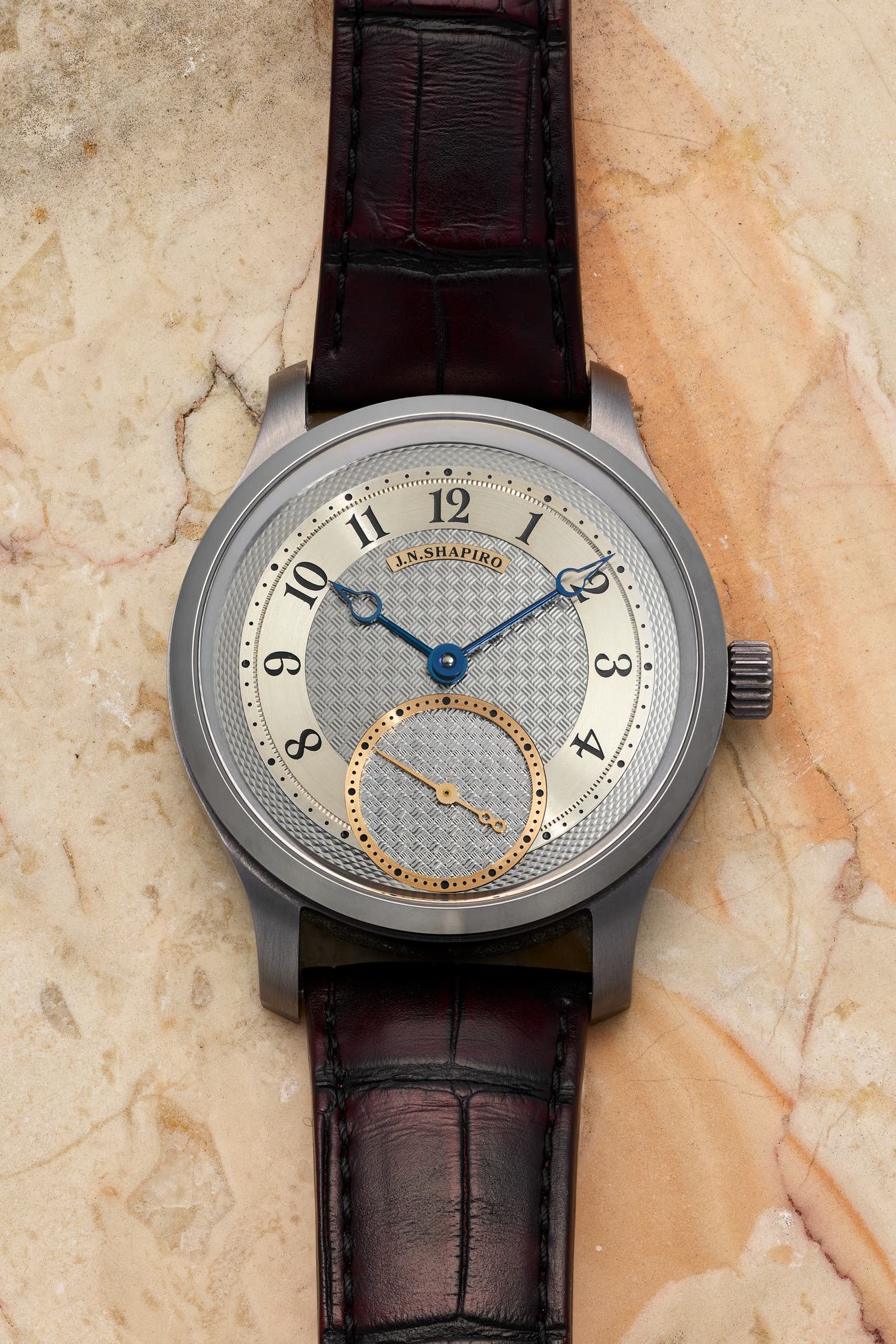 • The basketweave, one of the most technically demanding engine-turning patterns, underscores Shapiro’s peerless command of the craft.