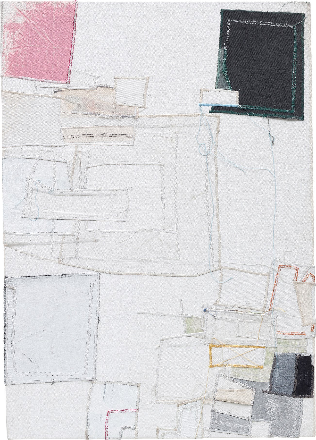 canvas, thread, fabric, acrylic and metallic paint