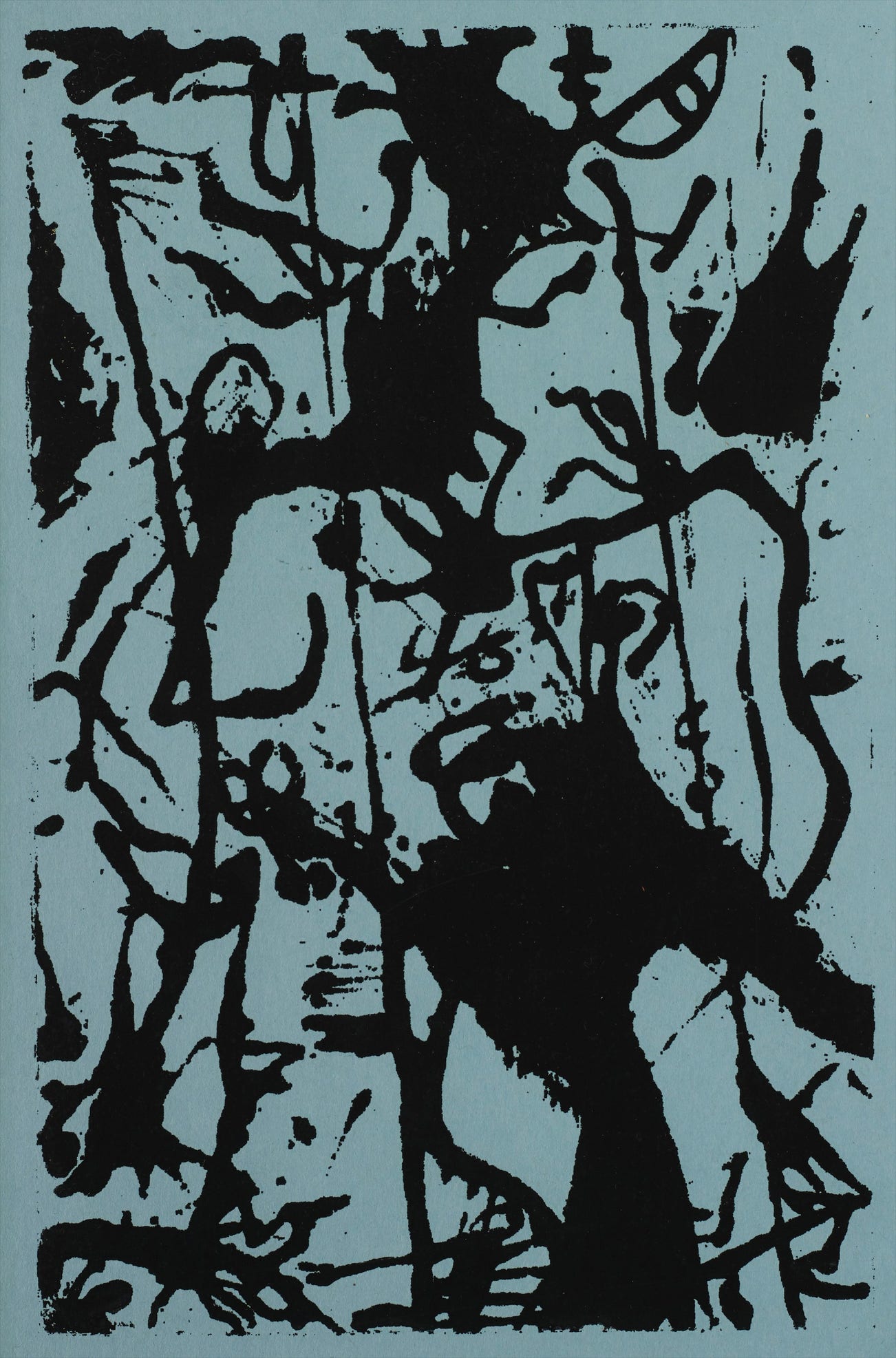 Unique screenprint in black, on blue wove paper, with margins.