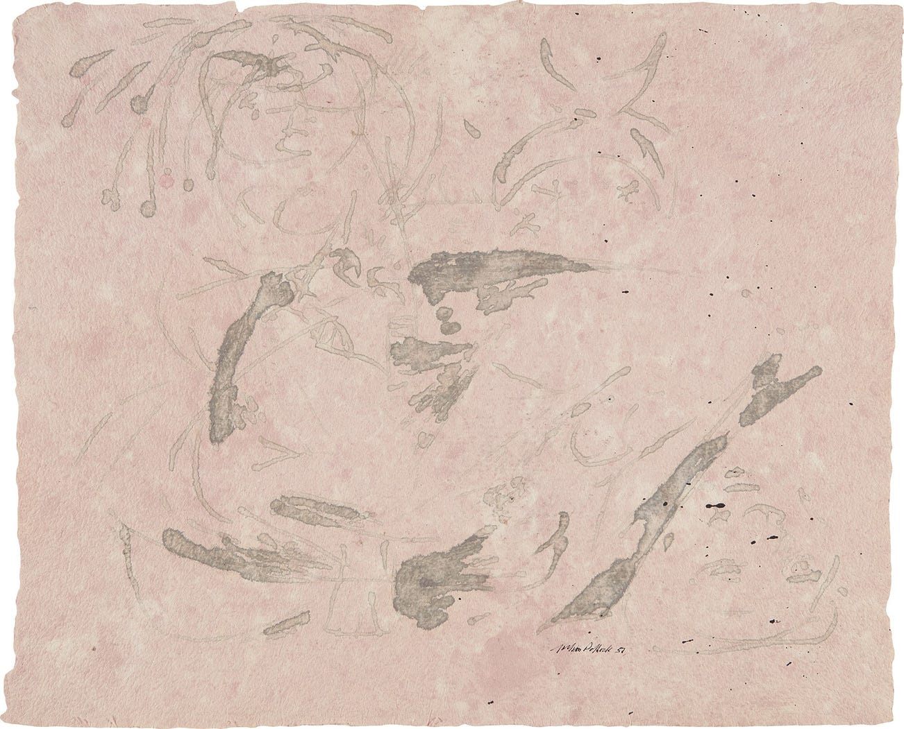 In 1951, Pollock also created a number of drawings, including Untitled, on unique handmade paper made specifically for him by Douglas Morse Howell at his Long Island studio using homegrown flax, linen tablecloths, denim, lace and flowers. He commissioned paper from Howell after seeing it used by Anne Ryan at Betty Parsons Gallery in 1951 at an exhibition of collages shown concurrently with works by his wife, Lee Krasner, highlighting the importance Pollock wanted the support to play in his drawings. The crevice-like textures and distinct colorations of this paper result in unforeseen outcomes and irregular edges to the drawn lines such that in the final product, the sheet itself is of equal weight to the artist’s calligraphic marks. Discussing Pollock's works on paper from 1951, art historian Bernice Rose describes: “Physically these drawings are characterized by their dematerialization of medium and their airy spaciousness… the only reference to the physical quality of his previous work is the density of soaked color as color, the way in which one way - or puddle - of color overlays another, and the way edges meet, establishing a discrete physical identity in spite of actual flatness. These are among Pollock’s most painterly works” (Jackson Pollock: Drawing into Painting, exh. cat., The Museum of Modern Art, New York, 1980, pp. 21-22). While these drawings reflect Pollock’s specific interest in the materiality and effects of the Japanese and Howell paper, they were also created in dialogue with the artist’s Black Paintings created at this time, reflecting the same limited color scheme, open composition, and the effects of staining. Exhibited recently at the Guggenheim in Berlin, Venice and New York in 2005-06 and Tate Liverpool in 2015, the present work manifests the sublime balance Pollock achieved between chance, materiality, and his inimitable use of line.