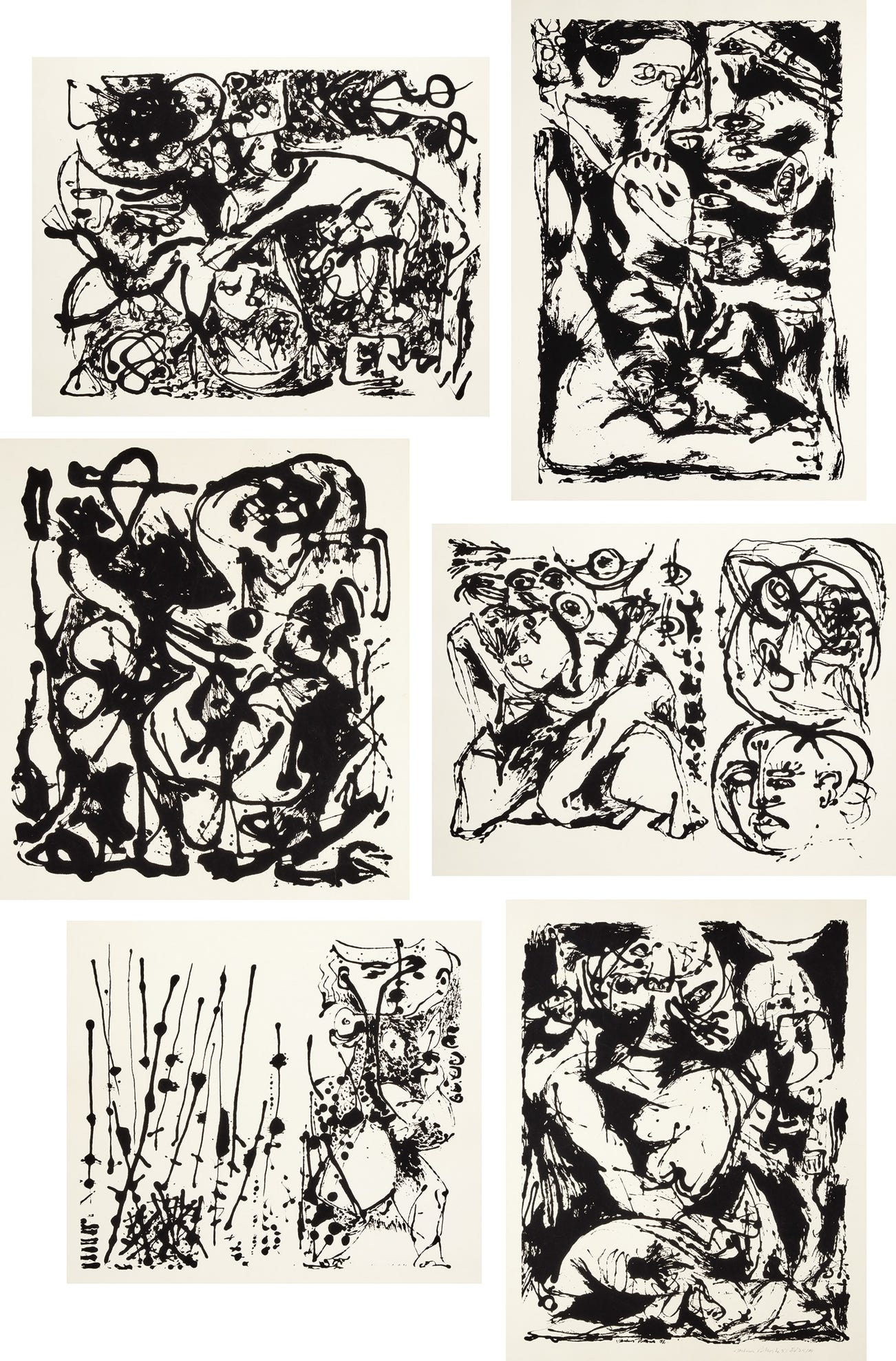 titles: Untitled (after Number 7, 1951); Untitled (after Number 8 - Black Flowing, 1951); Untitled (after Number 9, 1951); Untitled (after Number 19, 1951); Untitled (after Number 22, 1951); and Untitled (after Number 27, 1951)
