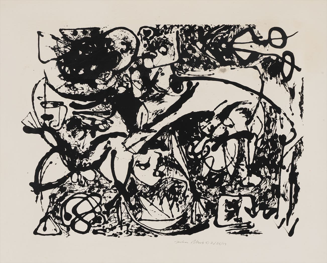 This work is based on Pollock's Number 8 (Black Flowing), oil on canvas, 1951 (O’Connor and Thaw 328). Betty Parsons, whose gallery on East 57th Street in New York exhibited many of Pollock's works, organised his fifth solo show in 1951, his Black Paintings. To coincide with the exhibition, Pollock made screenprints of six of the paintings, of which the present is an example. A proposed edition of 25 signed and numbered copies of each work was called for but it is widely believed to have never been completed. It was not until after the artist’s death, under the authorisation of Lee Krasner that the series was fully realised and published posthumously in an edition of 50 in 1964.