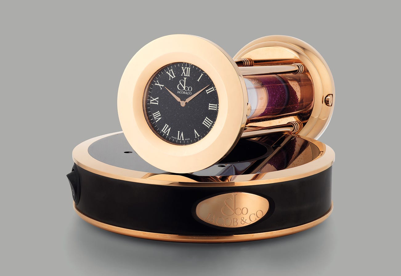 Founded in 1980 by Jacob Arabo in New York, the jeweler soon gained a reputation among celebrities. In 2002, Jacob & Co officially launched their very first timepiece with an emphasis on creating extravagant timepieces set with exquisite gem-stones. The present Hourglass timer from Jacob & Co in gold plated gilt brass is presented with an illuminated stand featuring pink gems that fall effortlessly in the hour glass. The present example is presented in “like new” overall condition and remains protected by its factory protective stickers.