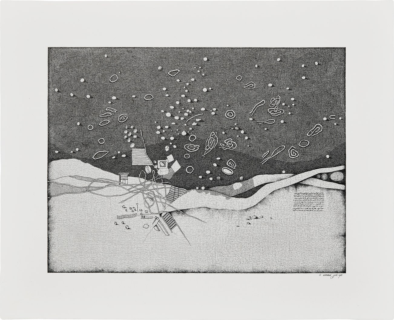 Black ink drawing, on gessoed canvas.