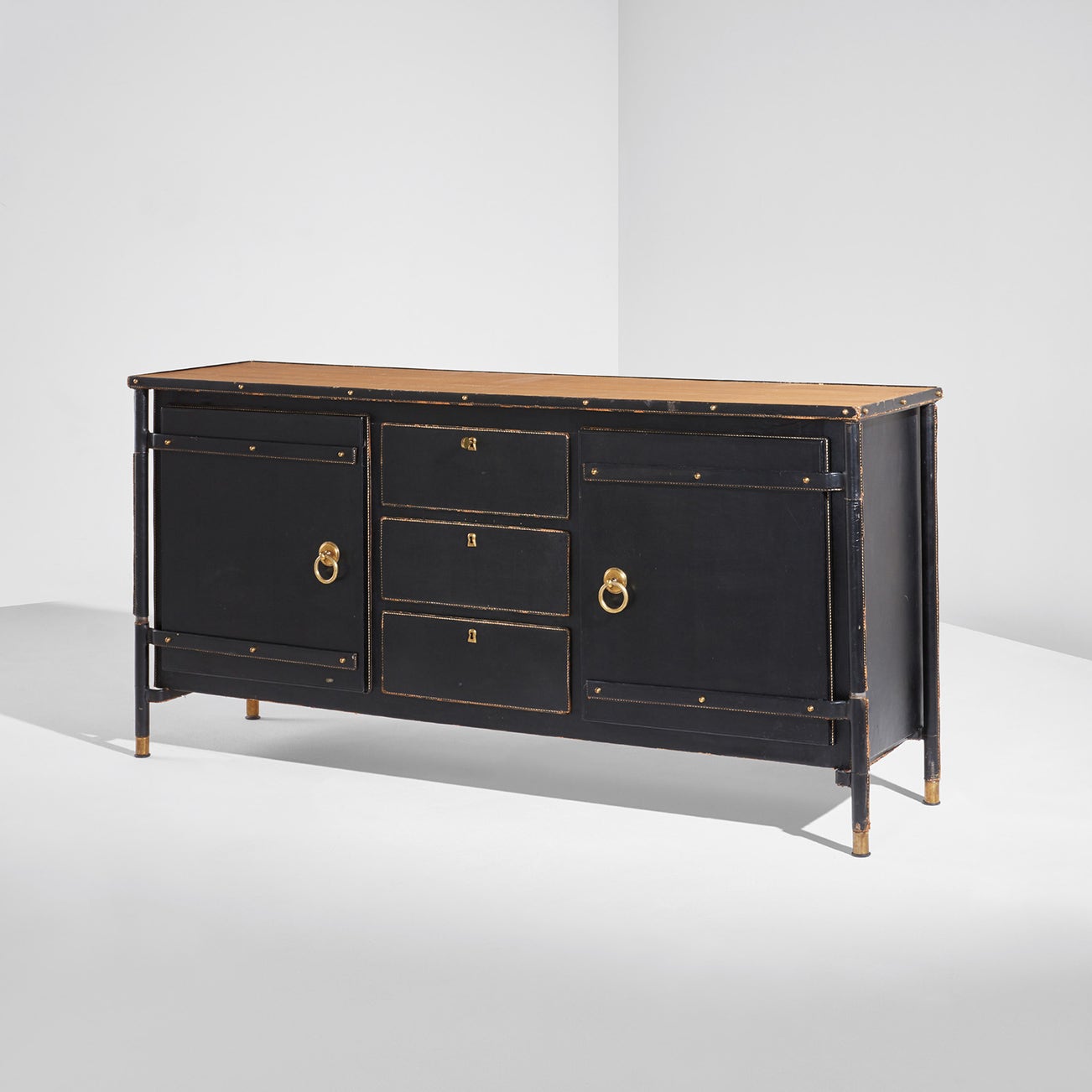 Leather-covered metal, leather, brass, brass-plated metal, elm.