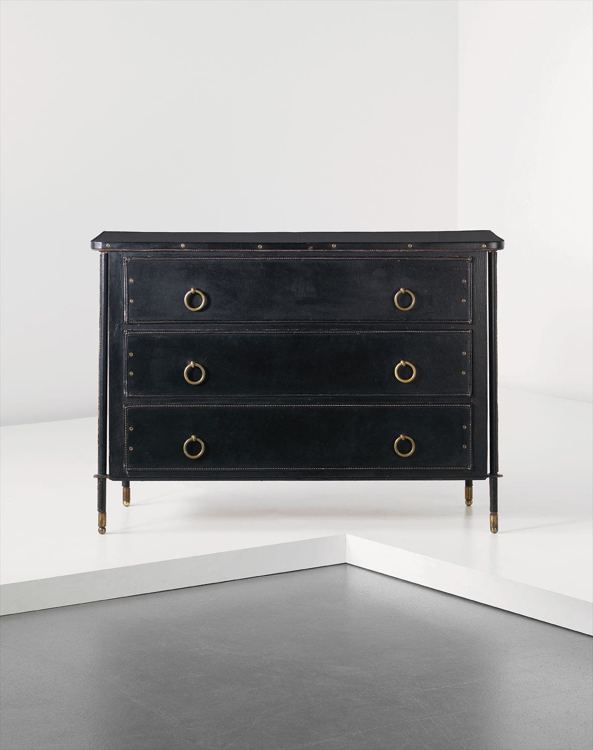 Leather-covered oak, leather-covered tubular metal, painted wood, brass.