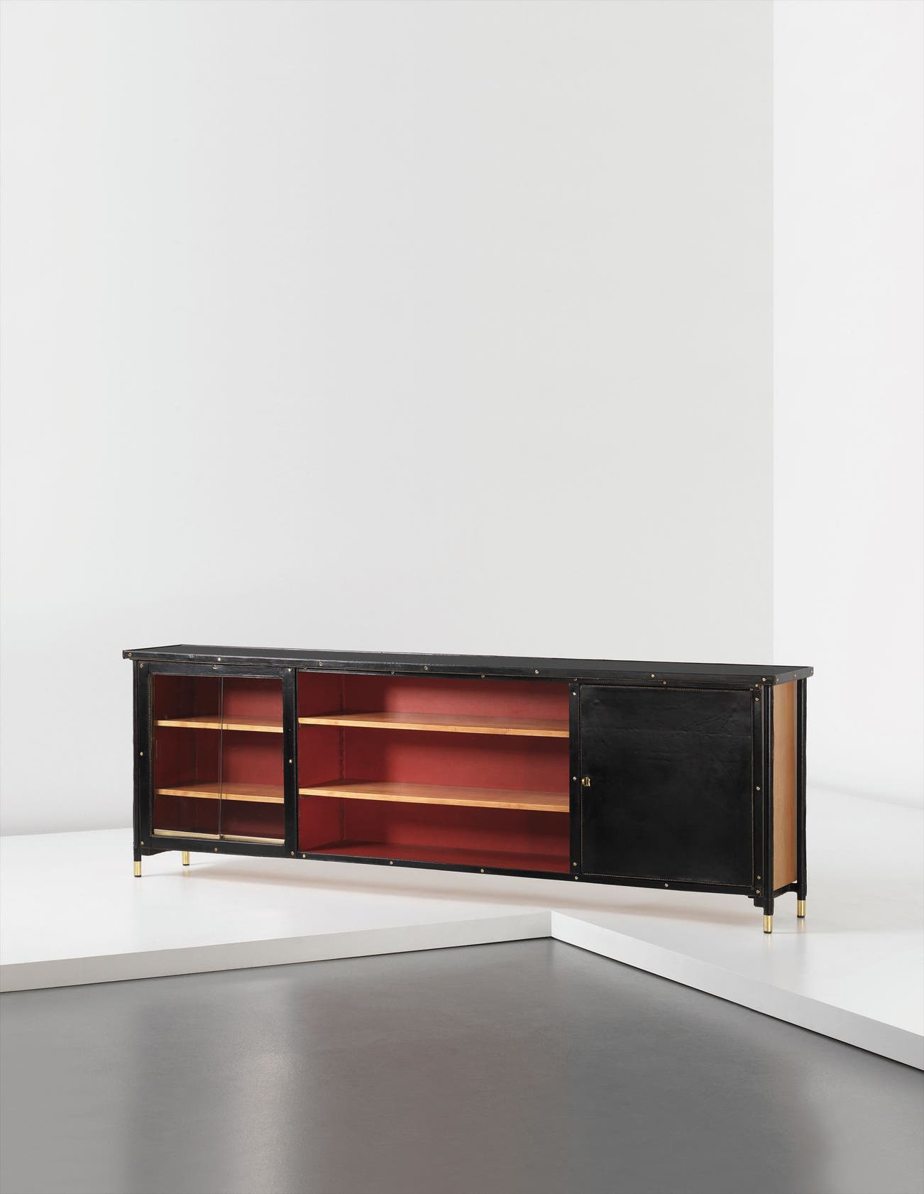 Leather-covered wood, leather-covered tubular metal, leather, painted wood, brass, glass.