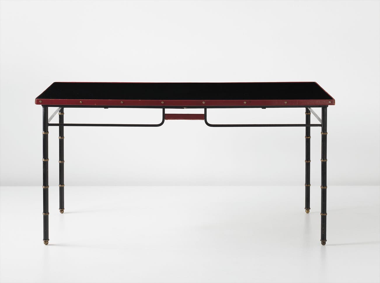 Leather-covered wood, painted tubular metal, painted metal, brass.