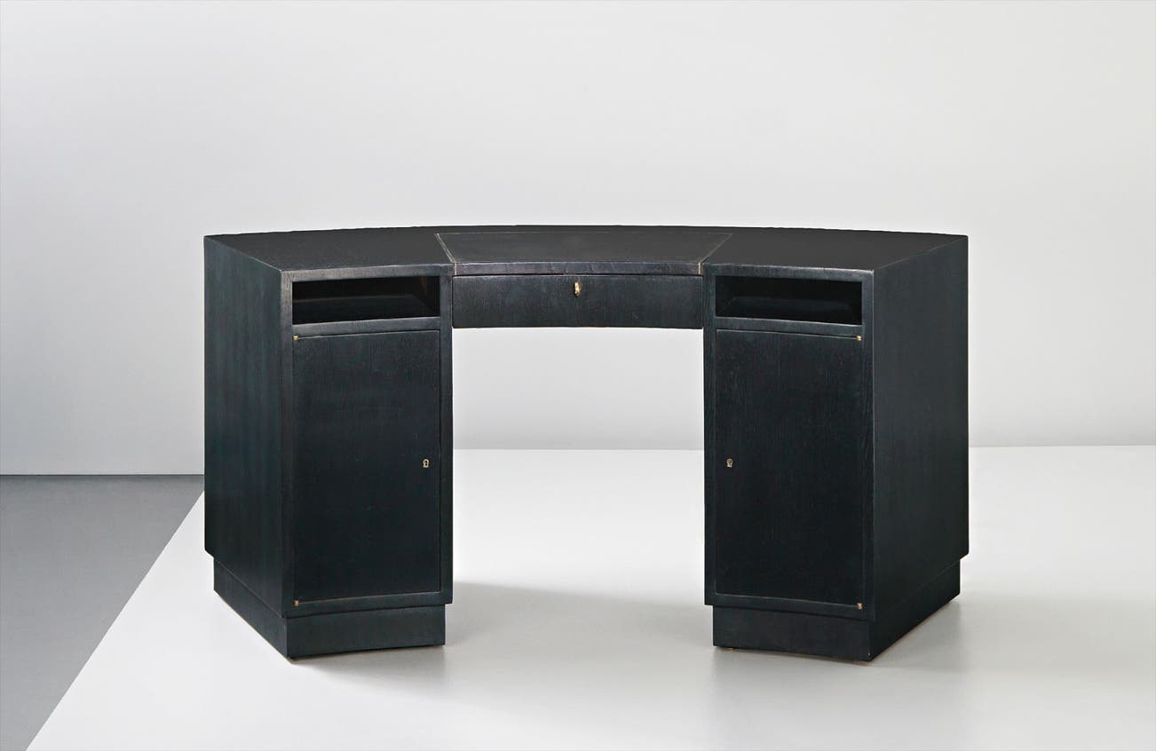 Leather-bound wood, ebonised wood, brass.