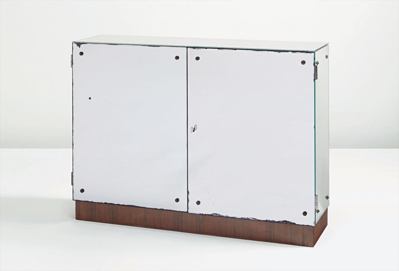 Mirrored glass, brass, chromium-plated metal, rosewood-veneered wood, mahogany.