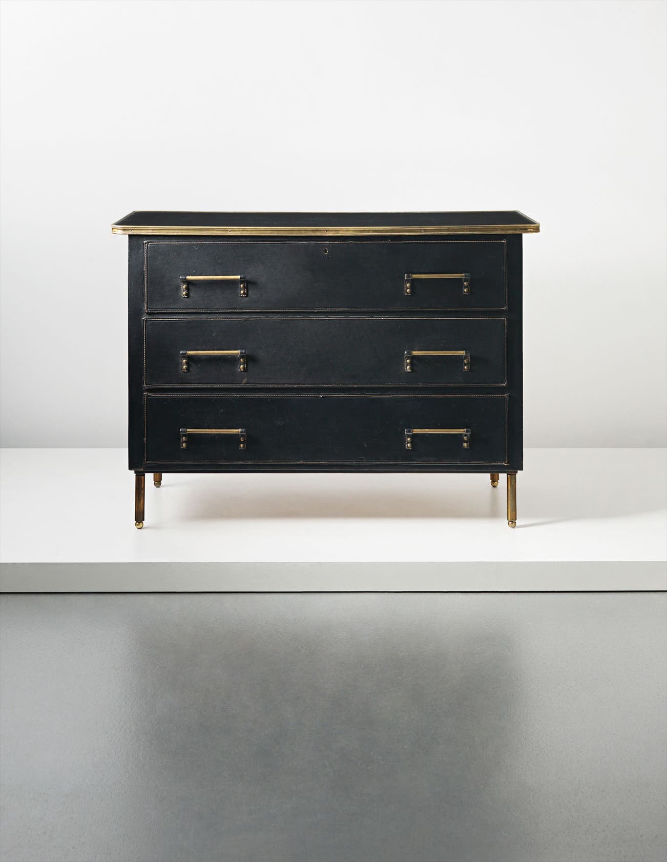 Leather-bound oak, Formica , tubular brass, painted metal, brass.