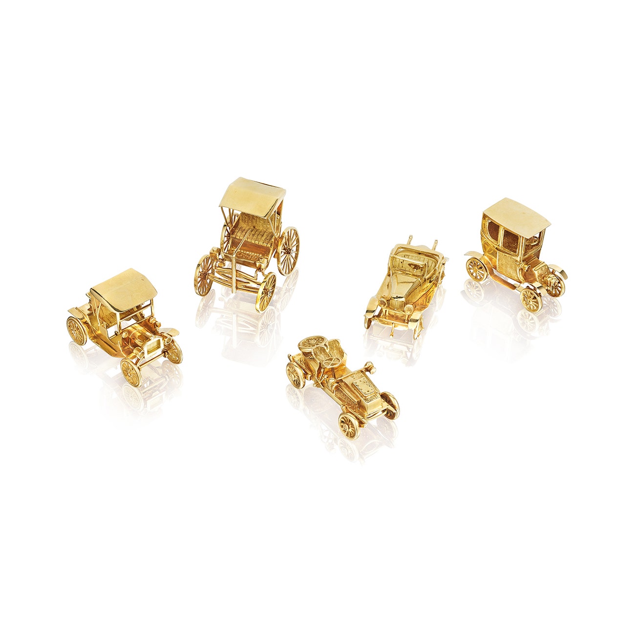 Comprising a model 'A' roadster, two-passenger coupé, a touring model, a motor wagon, and a three-person roadster, mounted in 18K yellow gold, three with French assay marks and maker's marks, two with French assay marks and partial maker's marks.