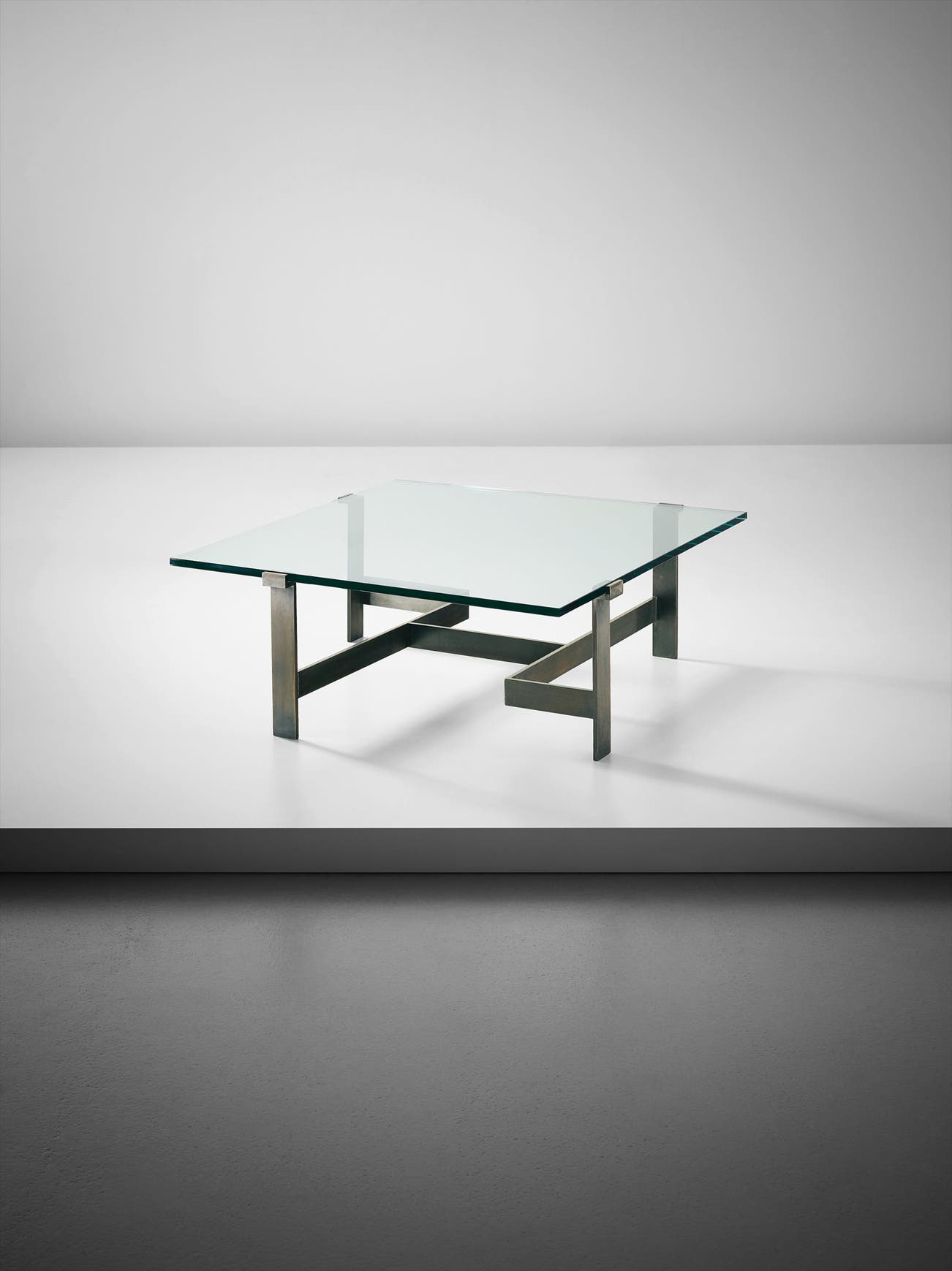 The present coffee table is one of Jacques Quinet’s most well-known designs from the height of long and productive career began in the late 1940s. It was during the 1960s that he attracted some of his most prominent commissions. The furniture and lighting from this period were not mass-produced, but obtained through special order. The crisp lines and elegant execution of Quinet’s work reflect his training as an architect and his early employment with a master cabinetmaker. Even as modernism was eclipsed by other movements and styles in the second half of the twentieth century, Quinet continued to emphasise a rigorous simplicity in his designs for furnishings and interiors. The present lot is an example of the austere metalwork that was simultaneously in the tradition of some of his forebears such as Pierre Chareau and anticipatory of the sleek styles of the 1970s.