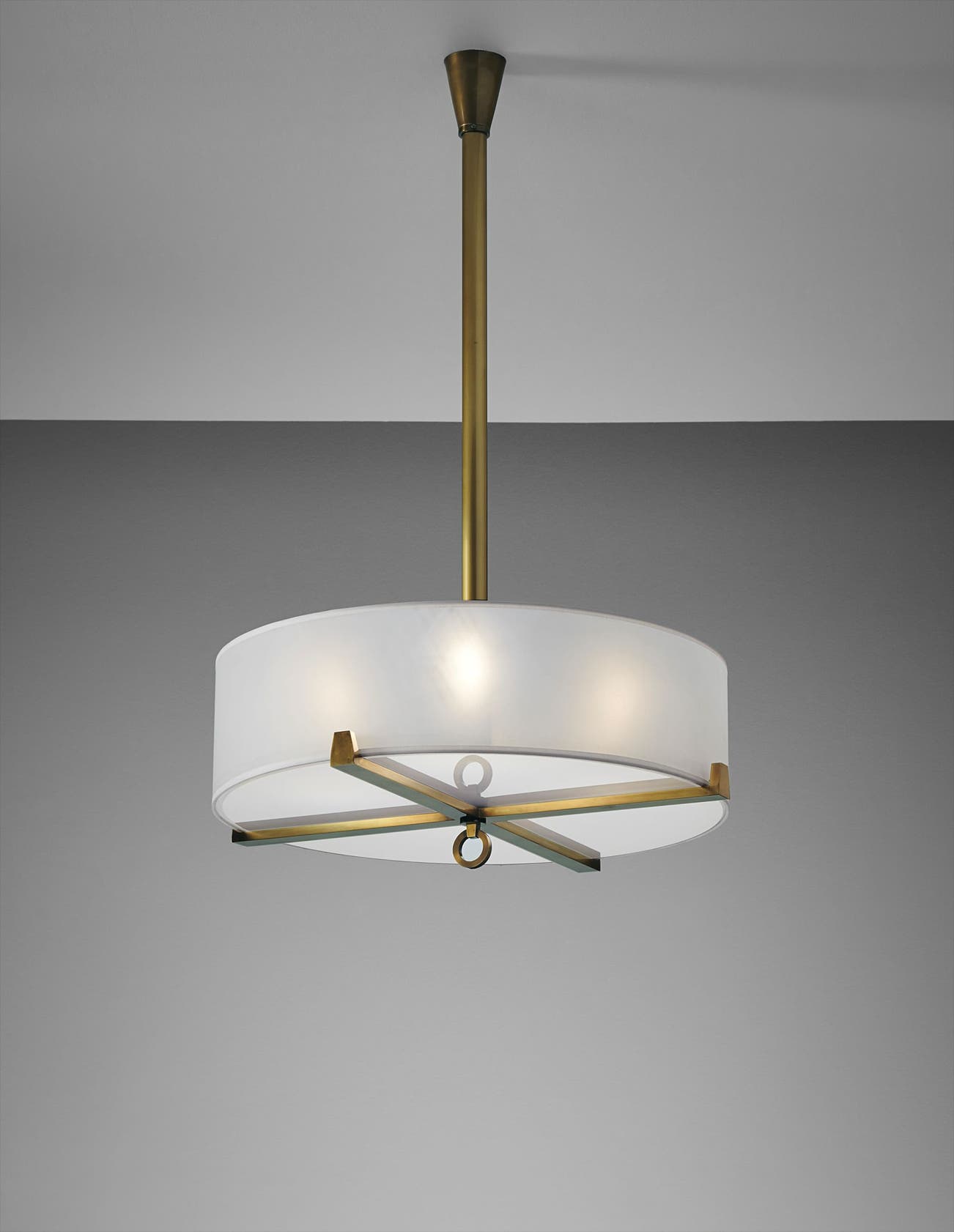 Patinated brass, patinated tubular brass, acrylic, cellulose shade.