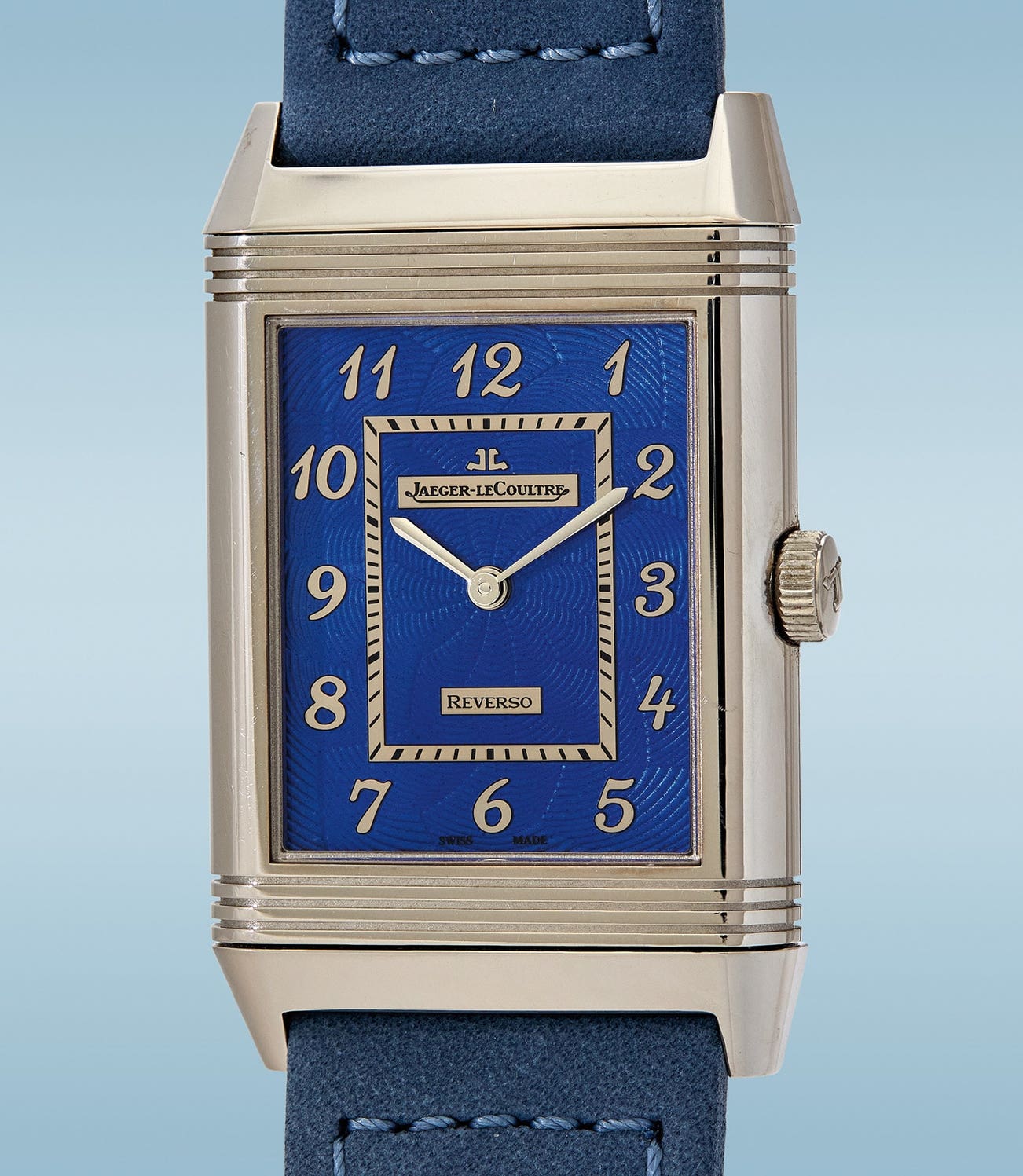 Simple and elegant in form, but commanding in presence, the present Reverso is a limited edition of fifty pieces from 2013, rendered in 18K white gold with a blue enamel dial. The lustre of white gold and the brilliant azure dial is an intoxicating combination. Large, Breguet-style Arabic numerals add legibility as well as elegance, and the placards bearing the maker and model name stand out proudly. The dial itself is a masterpiece of enameling, having endured twenty individual firings in a kiln, with the precise temperature and timing a mystery to all but the master artisan. The final layer of translucent enamel lends additional vibrancy and ensures durability. The guilloché motif swirls out from the center of the dial; first floral in appearance and then melding into an almost cloud-like design. All this is completed, start to finish, entirely by hand.