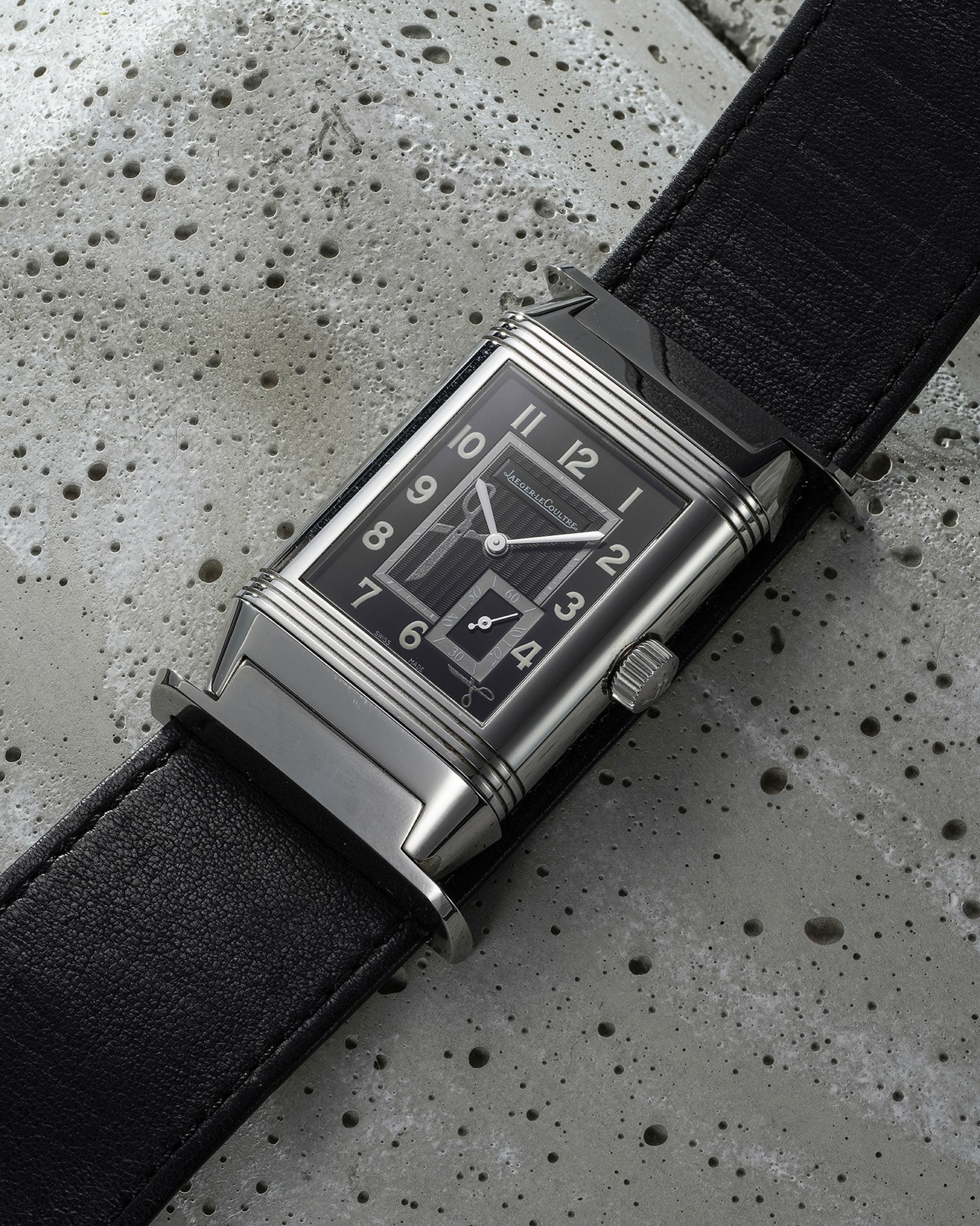 - The present limited edition Grande Reverso 8-days from Jaeger Le-Coultre features an outer black enamel dial with guilloché finishing in the center and small seconds at 5 o'clock. The grand taille gives the watch a delightful sporty appearance.