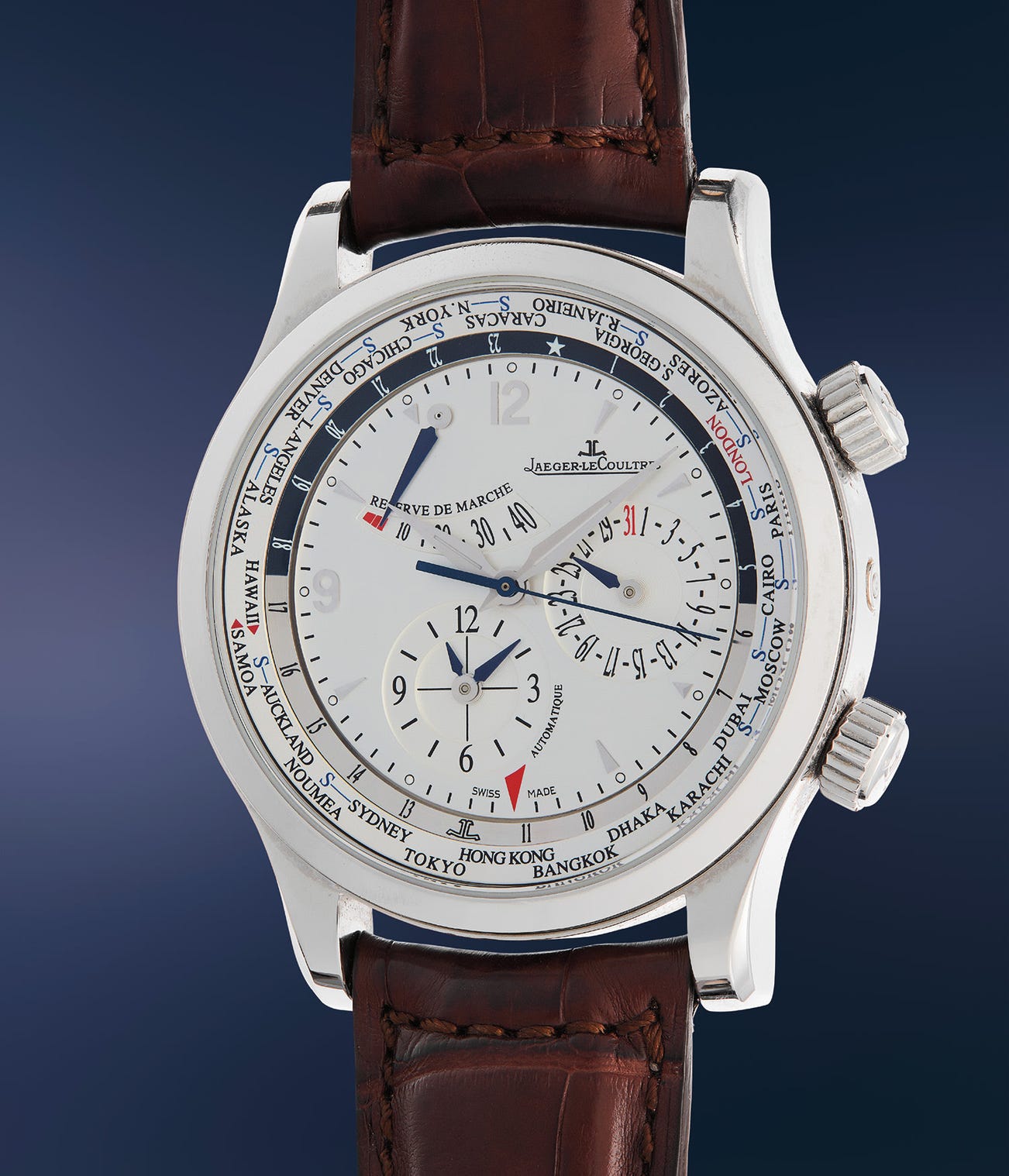 The present dual and world time wristwatch features an independent, adjustable hour hand and second time zone that is easily read and adjusted with the subsidiary dial between the 6 and 8 o’clock. The city of the second time zone is indicated with a red marker at 6 o’clock, with the outer world cities wheel rotated through a second crown in the case. Accompanied with original guarantee and fitted presentation box, this model is ideal for international travel.