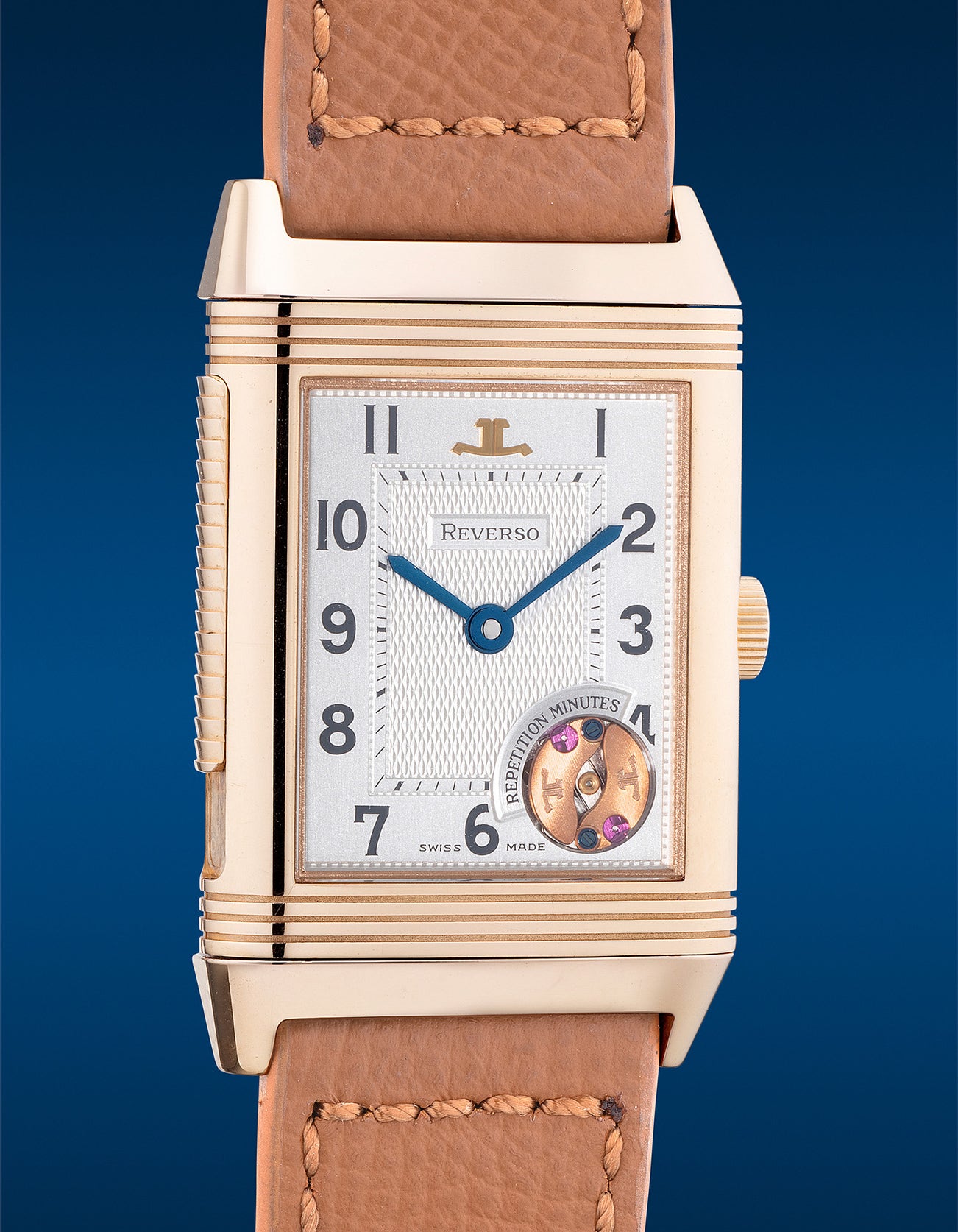 A very fine and rare limited edition pink gold minute repeating rectangular-shaped reversible wristwatch with guarantee and presentation box, numbered 35 of a limited edition of 500 pieces