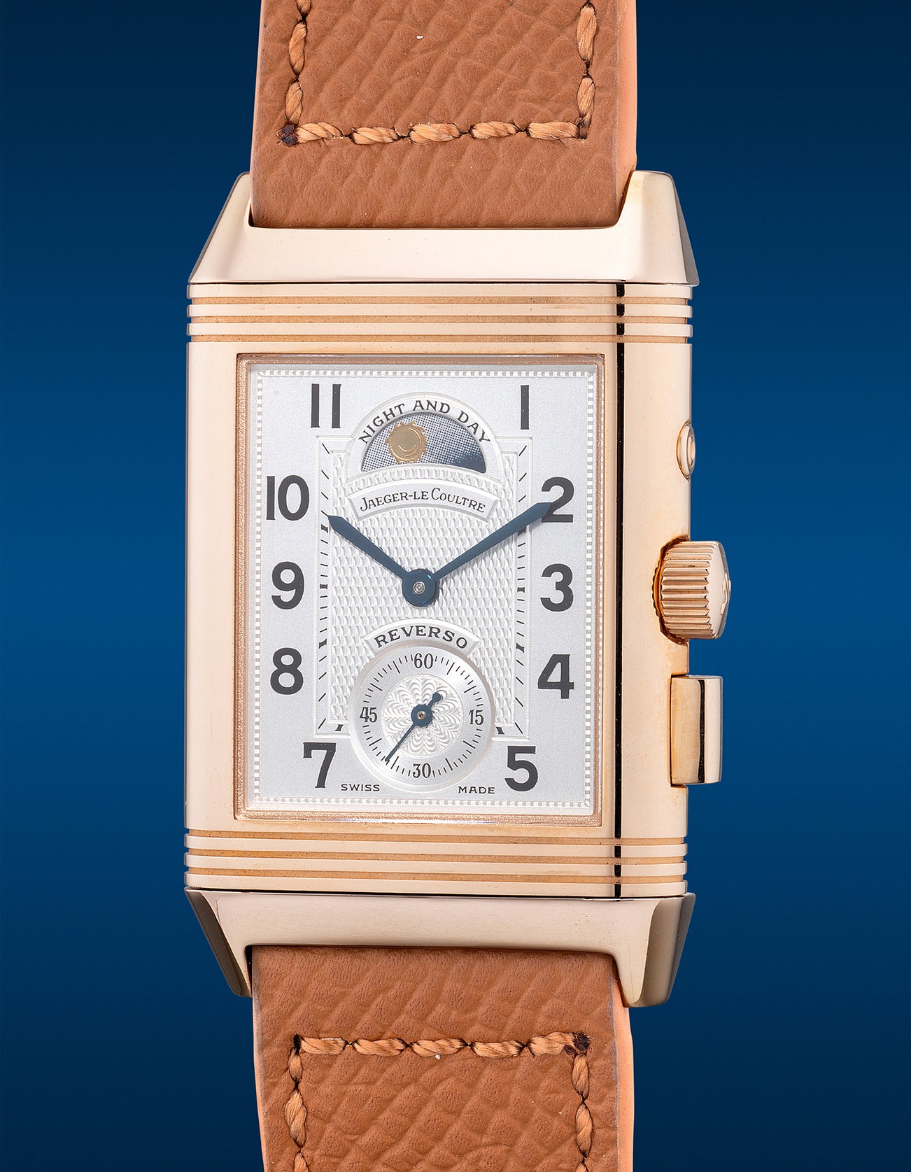 A fine and rare pink gold rectangular-shaped reversible dual-time wristwatch with small seconds, day and night indication, certificate and presentation box, numbered 35 of a limited edition of 500 pieces