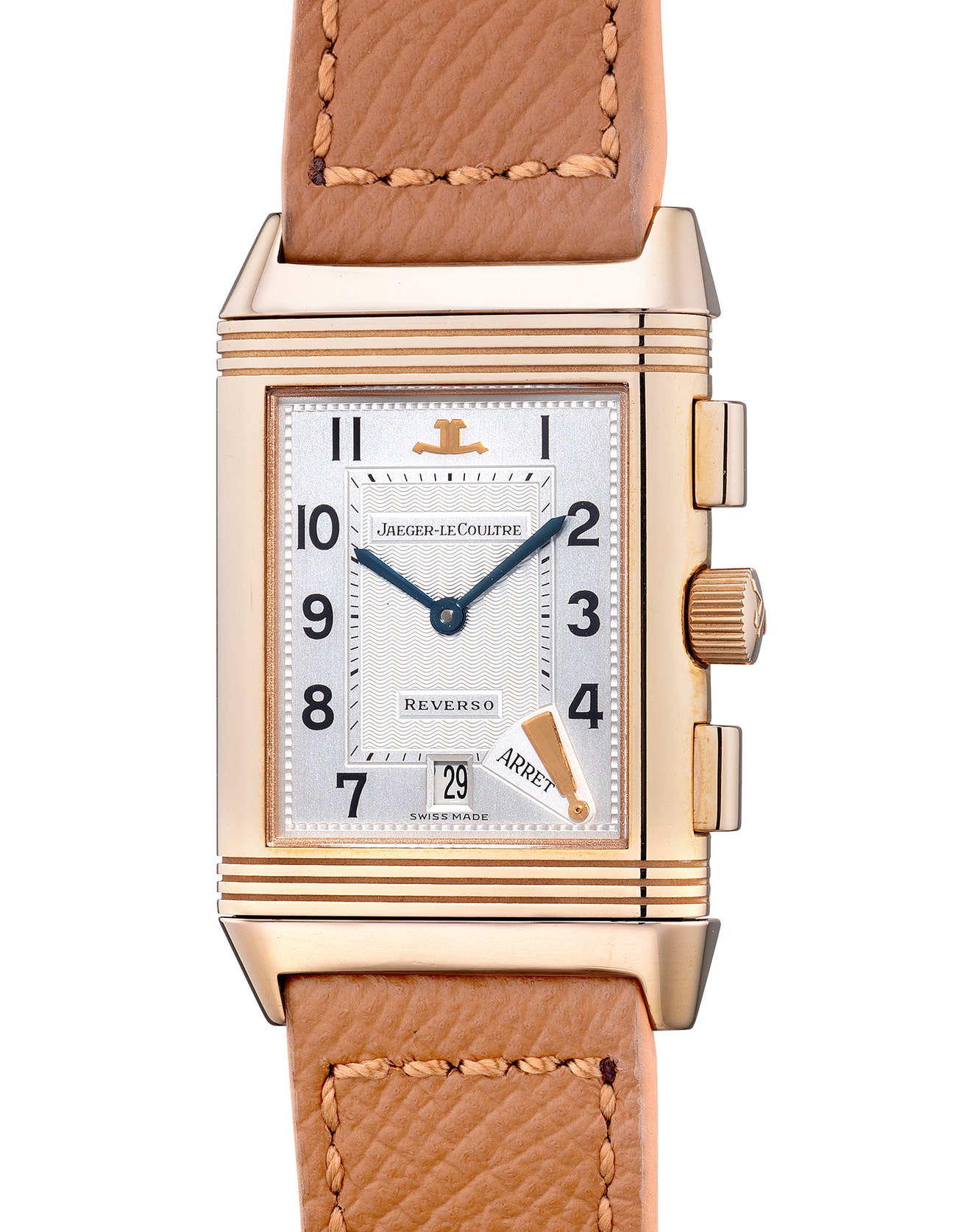 Presented in excellent overall condition, the present Reverso Chronographe Retrograde in pink gold is a true collector’s piece for Jaeger-LeCoultre enthusiasts, complete with its original accessories.