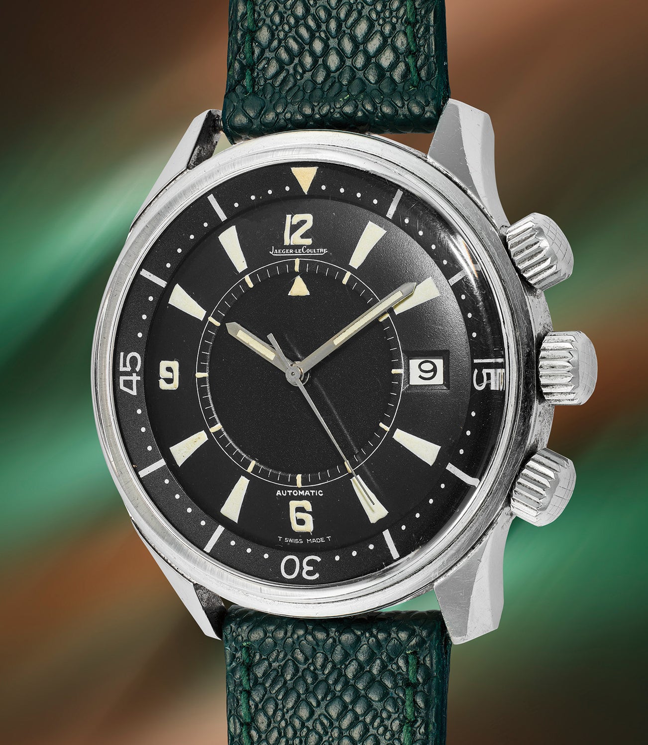 Known in the United States as the Polaris, and in the European market as the "Skin Diver Memovox", the reference E859 was made in 1714 total examples. The present European E589, signed Jaeger-LeCoultre on the dial, is amongst the finest examples to come to market. Well-preserved with a sharp case that in our opinion has never seen a polishing, its beautifully aged dial is flawless, with all luminous material original and fully intact.. The beauty of the case’s design is enhanced by the presence of the original and rarely seen rounded, domed crystal – most surviving examples are instead fitted with service crystals with a sharp edge.