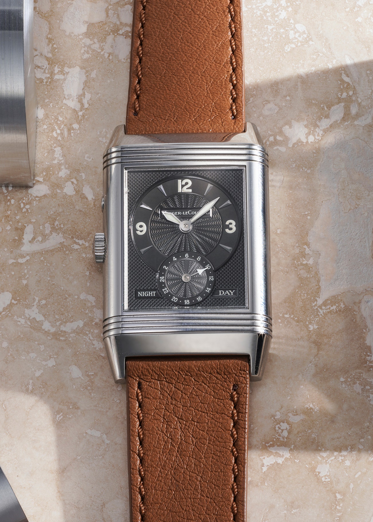 - The present Jaeger-LeCoultre Reverso Duo in stainless steel showcases a dual time function, complemented by small seconds on one side and a 24-hour register on the other. Elegant and simple, the silver white dial is adorned with a guilloché center, sober Arabic numerals and is accompanied by a small seconds subdial positioned at 6 o'clock, making it perfect for day usage.The reverse side, on the other hand, features a black "Clous de Paris" guilloché dial, adding an evening wear flair that exudes sophistication. The hands mirror the sword shape from the front dial but are equipped with SuperLuminova for enhanced visibility in low-light conditions. Additionally, a day-night indicator is made available as well.