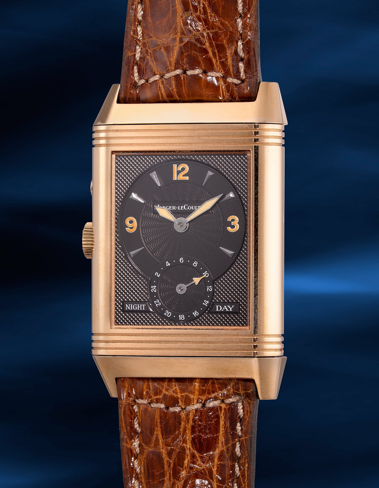 A fine and attractive pink gold reversible dual-time wristwatch with small seconds, day/night and 24-hour indication, guarantee and presentation box