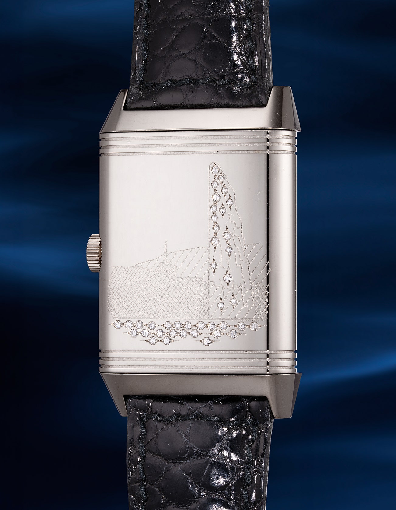 • Launched in 1995, this limited edition was produced in a total of 50 pieces: 30 in yellow gold and 20 in white gold. One side displays elegant small seconds and a clean guilloché dial - perfect for daytime elegance. The reverse reveals a beautifully engraved scenery of Switzerland. Decorated with 40 diamonds (0.16 carat), a skyline of the famous Geneva City with the famous Geneva fountain and the Catherdral Saint-Pierre can be found on its reverse.