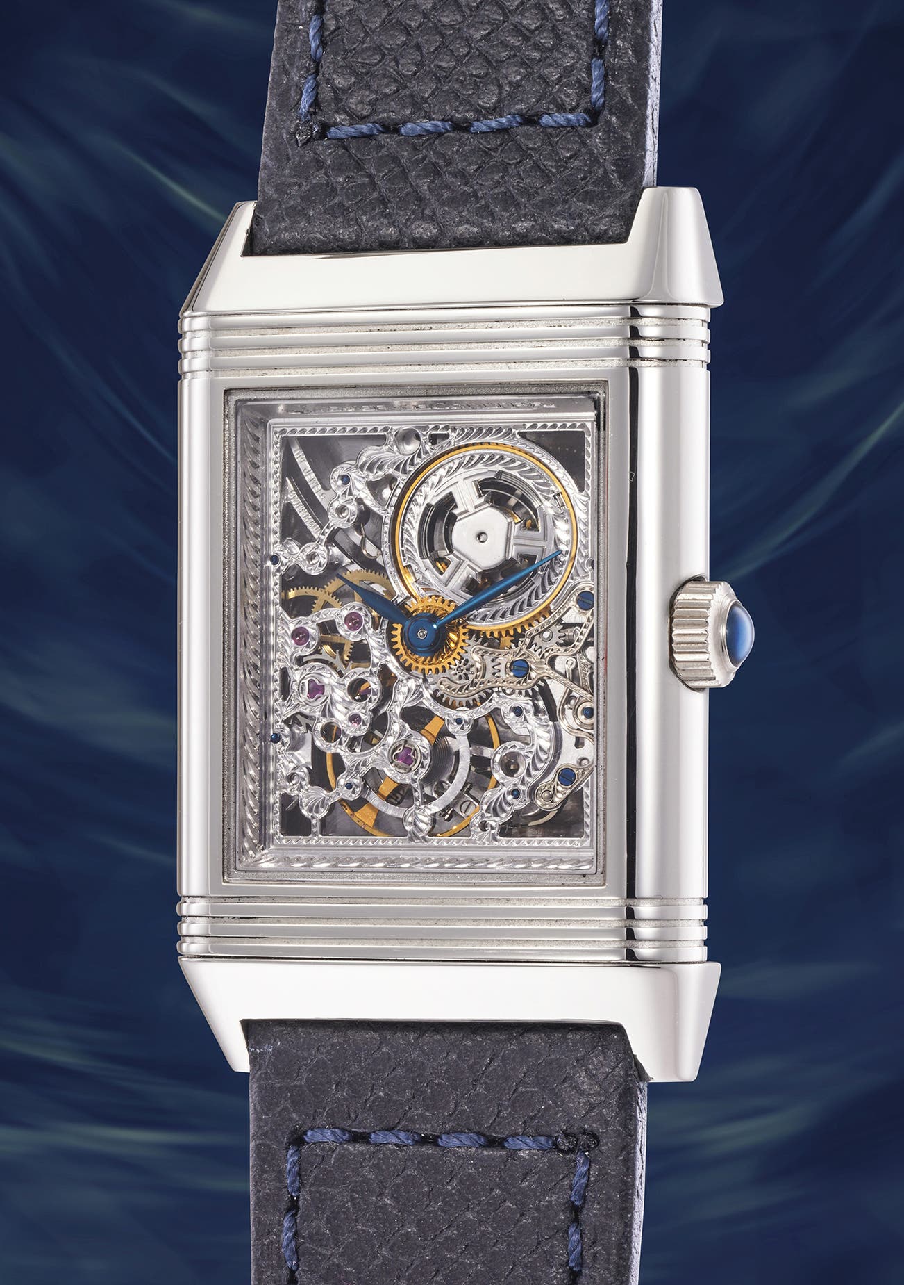 Carrying the reference number 270.6.49, the present watch is a model among the Number One series, which was sold from 2001. With a case made of platinum and a skeletonized dial that can be admired from both sides, the model was most notably the very first Reverso to be cased in platinum. The skeletonisation was done entirely in-house at newly established metiers d’art workshop in manufacture. Numbered 123, the present timepiece is one among 500 pieces from the series.